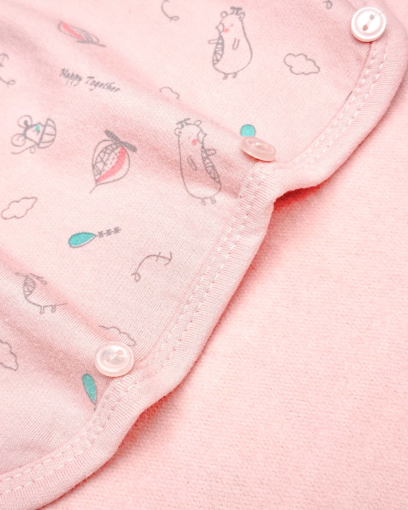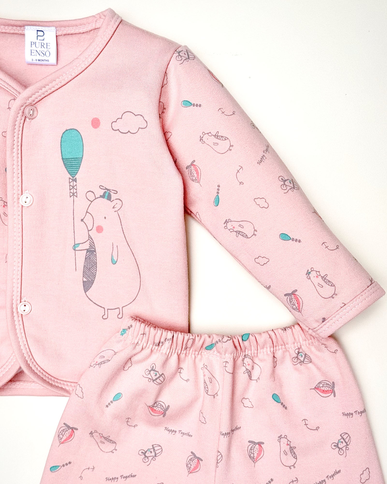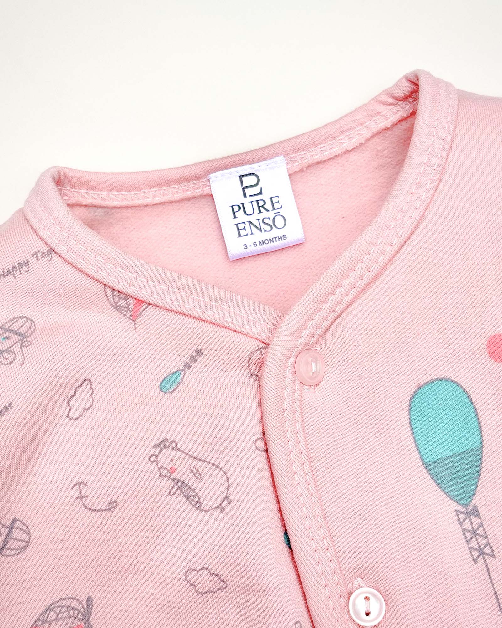 Let your little bundle of joy drift into dreamland wrapped in ultimate coziness with our Bear Balloon Printed Fleeced Front Open Night Suit. This irresistibly soft, light pink nightwear features a playful bear holding a balloon surrounded by charming mini cloud and animal prints—designed to brighten bedtime and inspire sweet dreams.