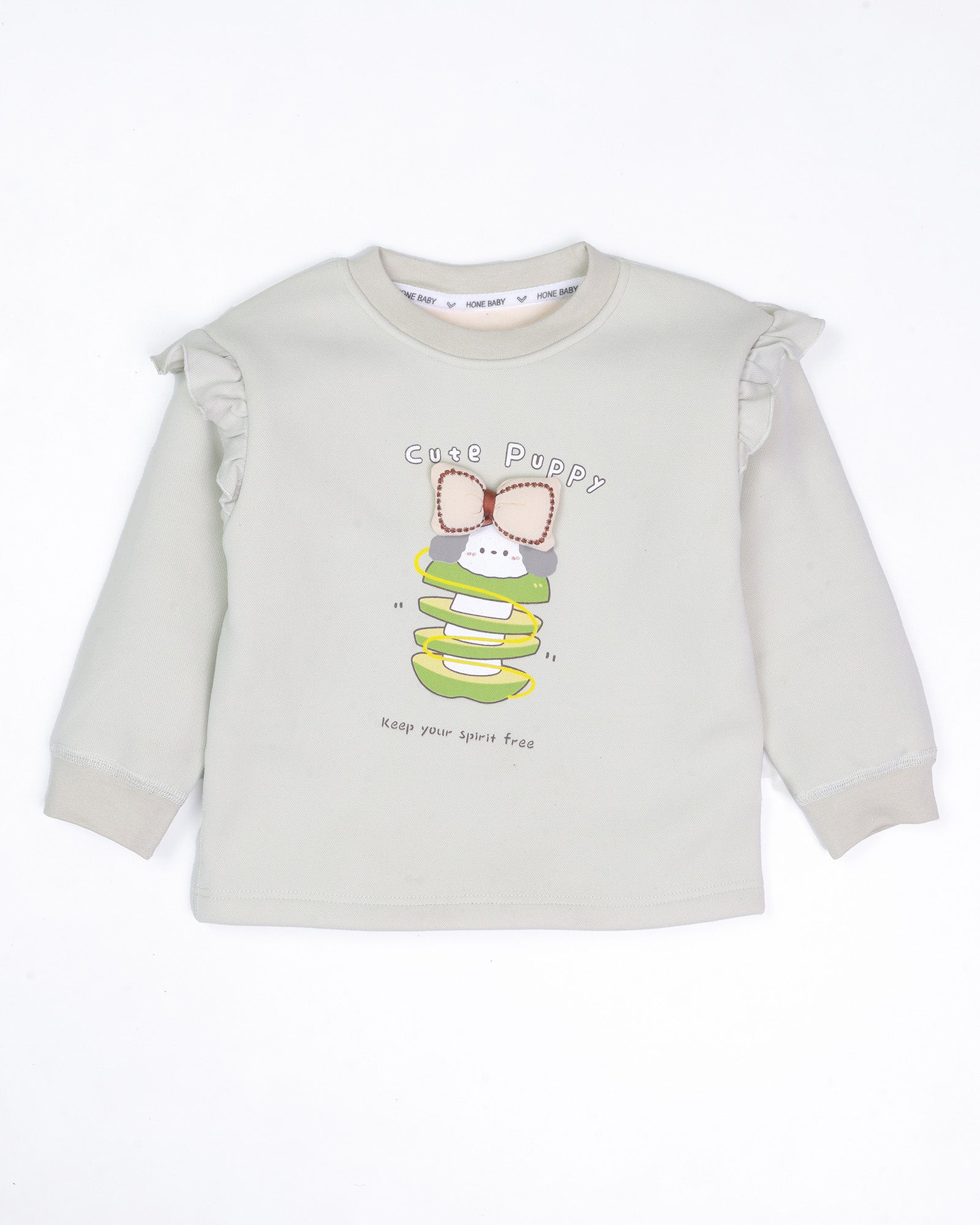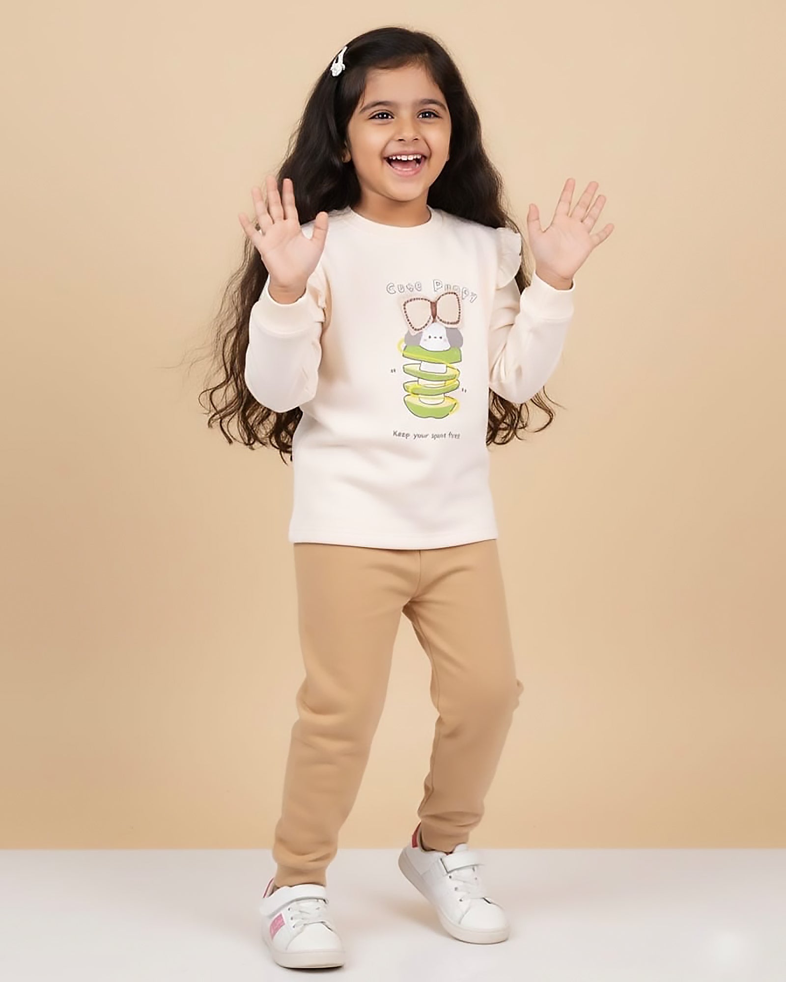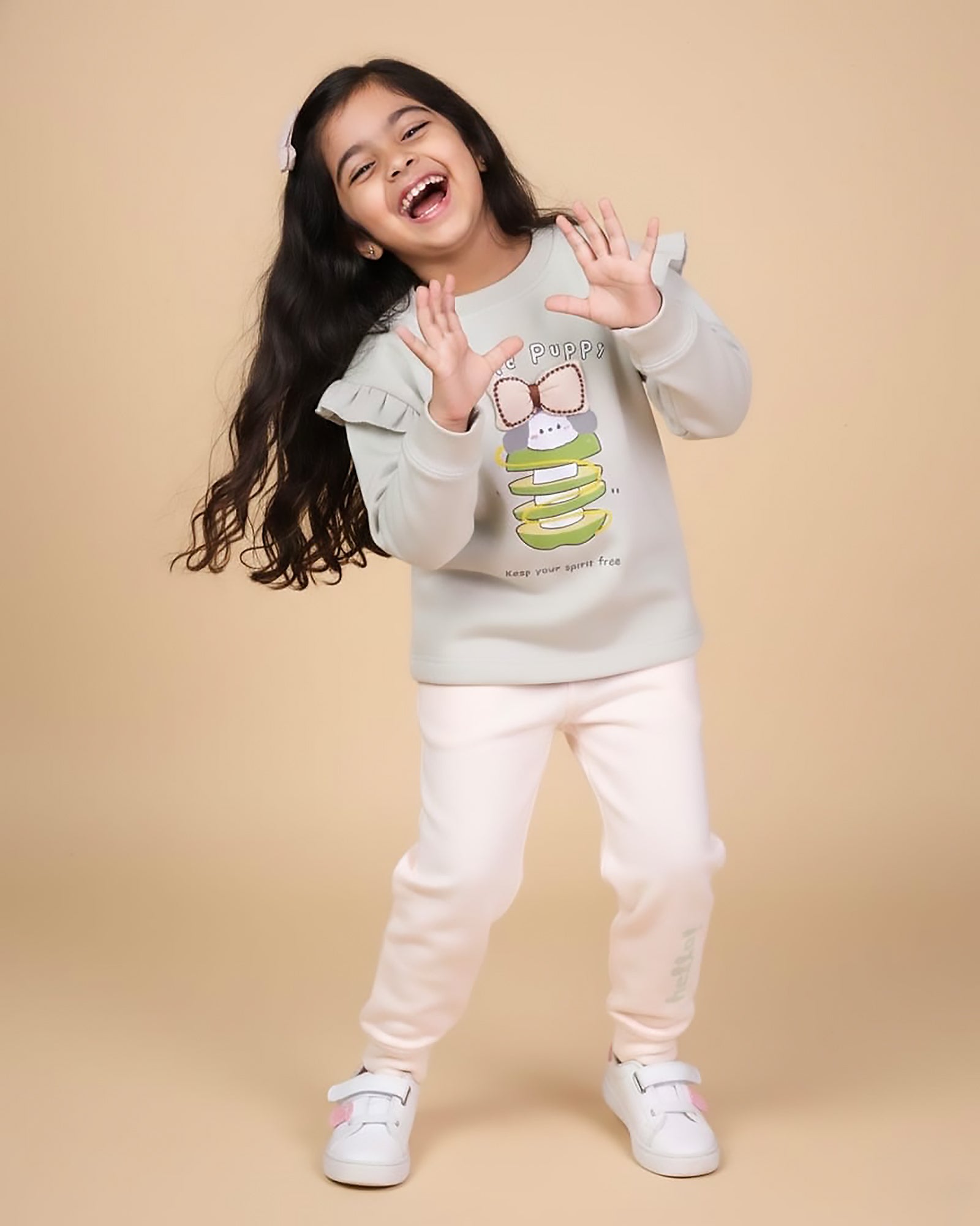 Designed for the little girl who loves to sparkle and play, this set is a masterpiece of cozy-chic fashion. The soft sage green sweatshirt features a delightful whimsical graphic accented with a beautiful 3D bow applique, while the playful ruffled shoulders add a touch of boutique charm. Paired with contrasting cream-colored fleeced joggers, this co-ord set is the perfect outfit for festive twirling, park playdates, or indoor winter fun.
