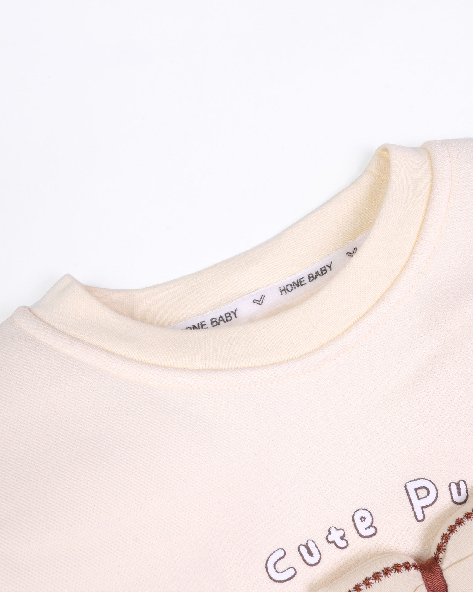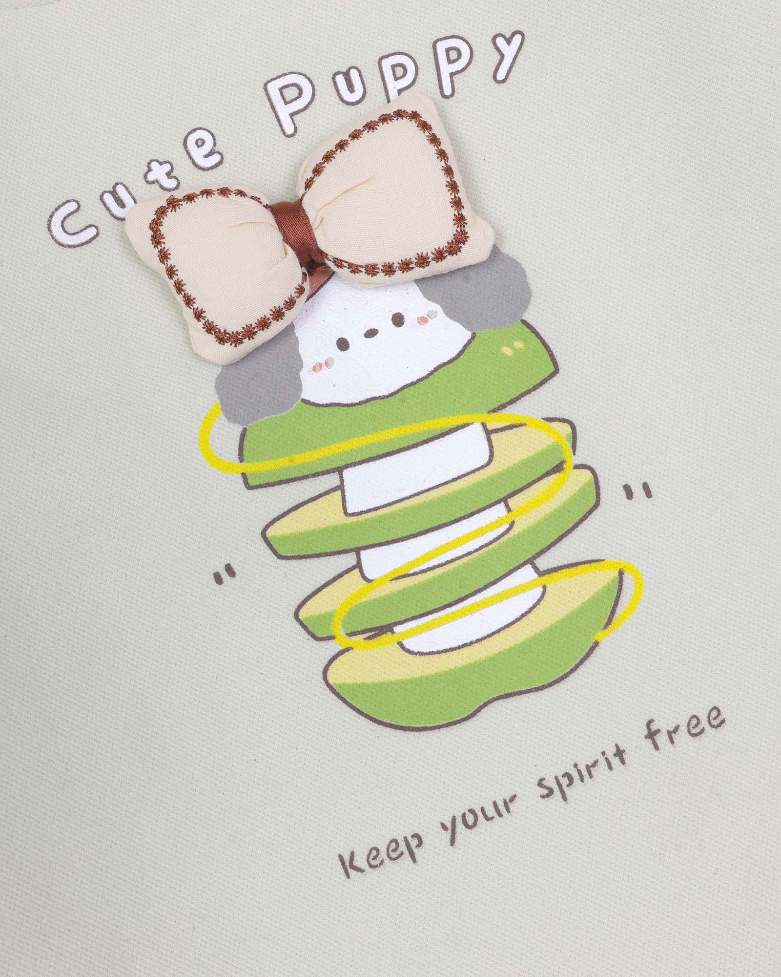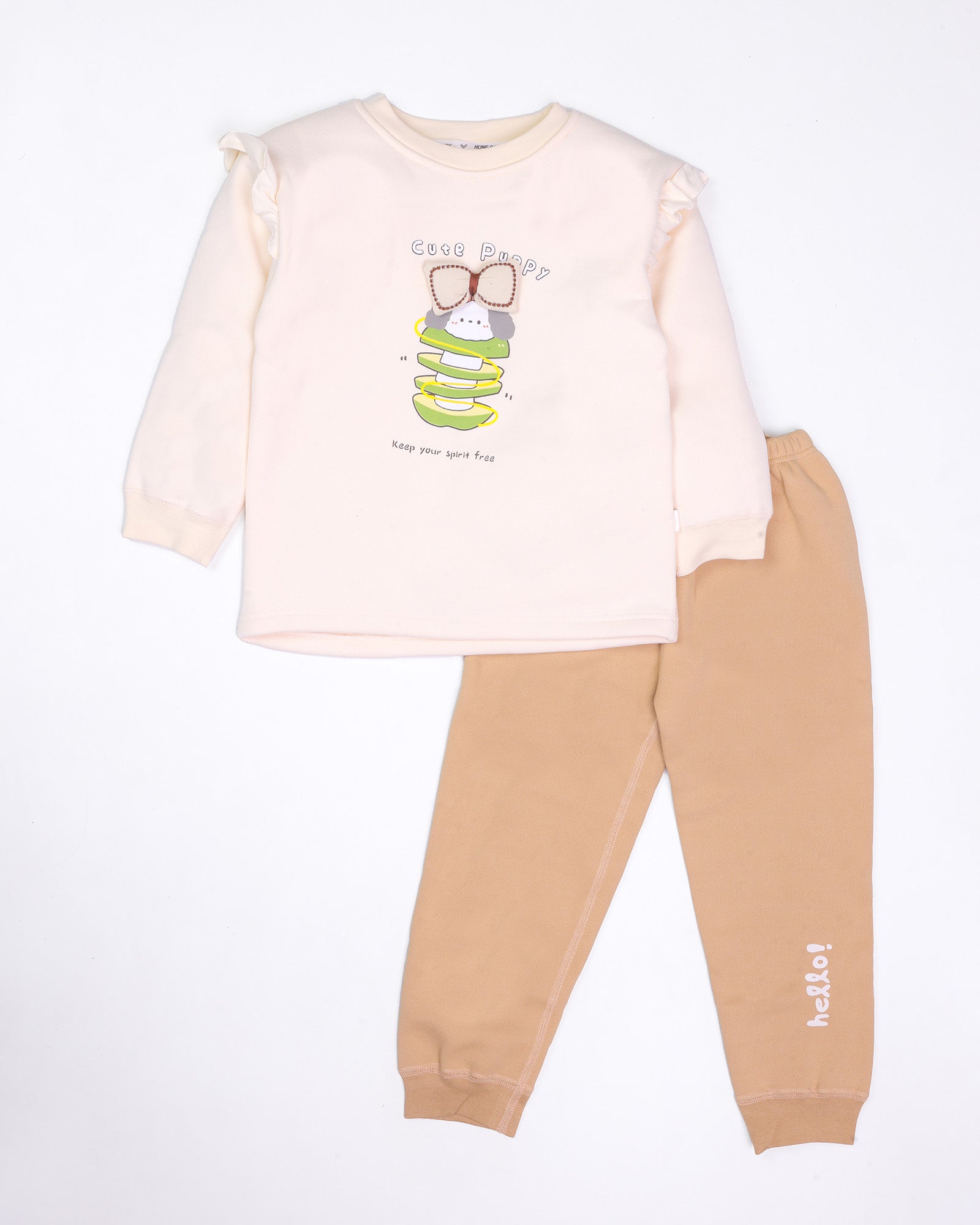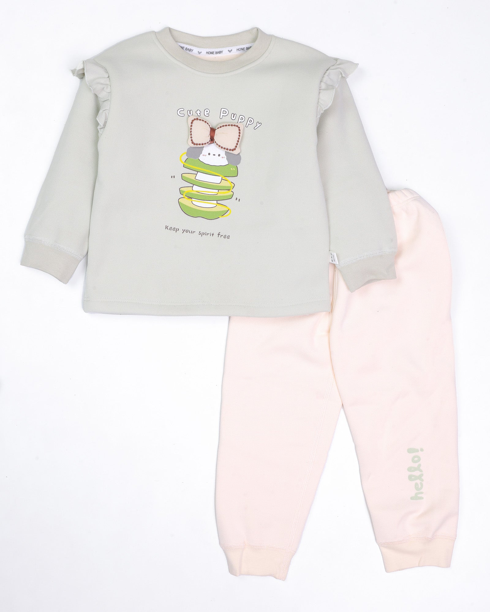 Designed for the little girl who loves to sparkle and play, this set is a masterpiece of cozy-chic fashion. The soft sage green sweatshirt features a delightful whimsical graphic accented with a beautiful 3D bow applique, while the playful ruffled shoulders add a touch of boutique charm. Paired with contrasting cream-colored fleeced joggers, this co-ord set is the perfect outfit for festive twirling, park playdates, or indoor winter fun.
