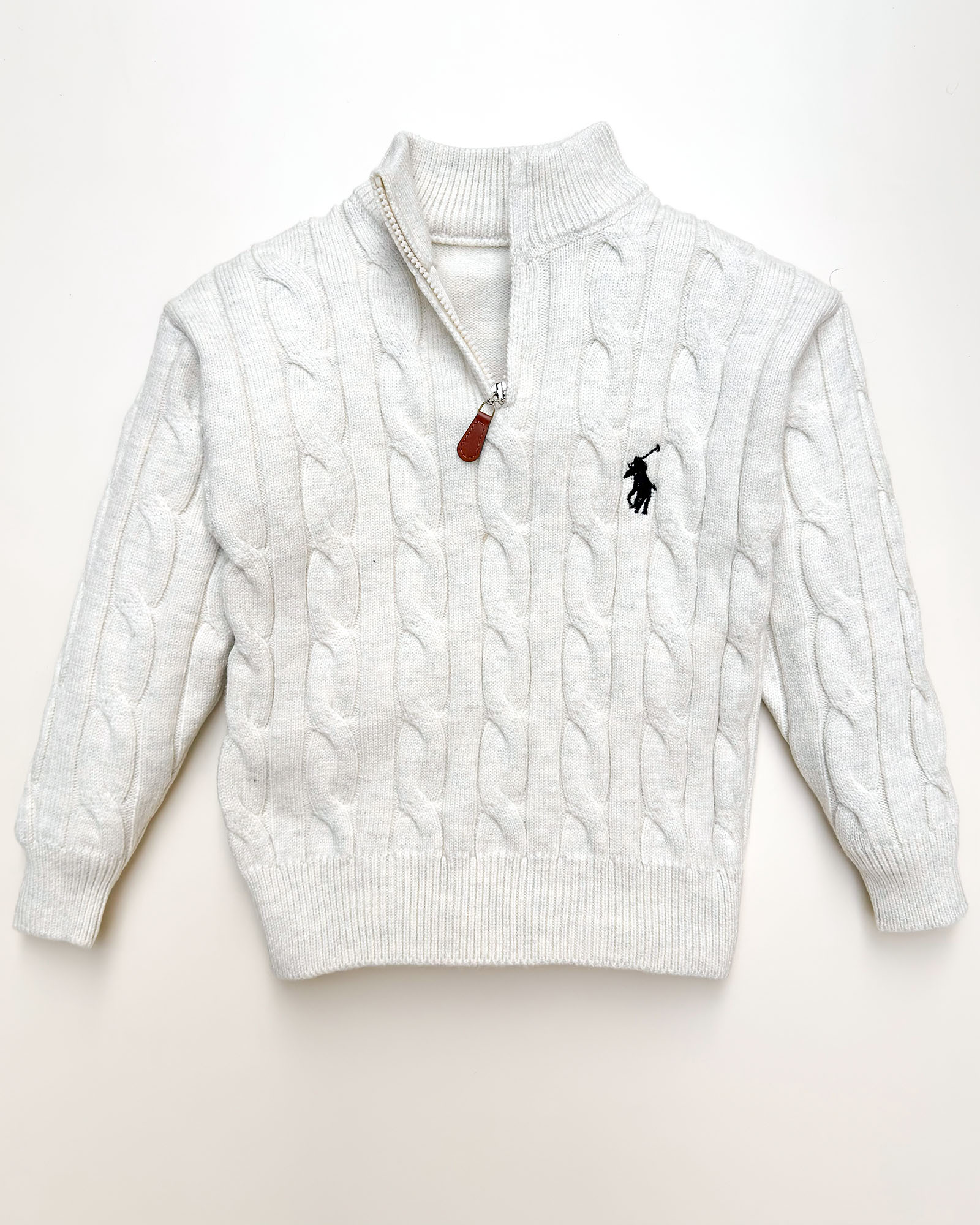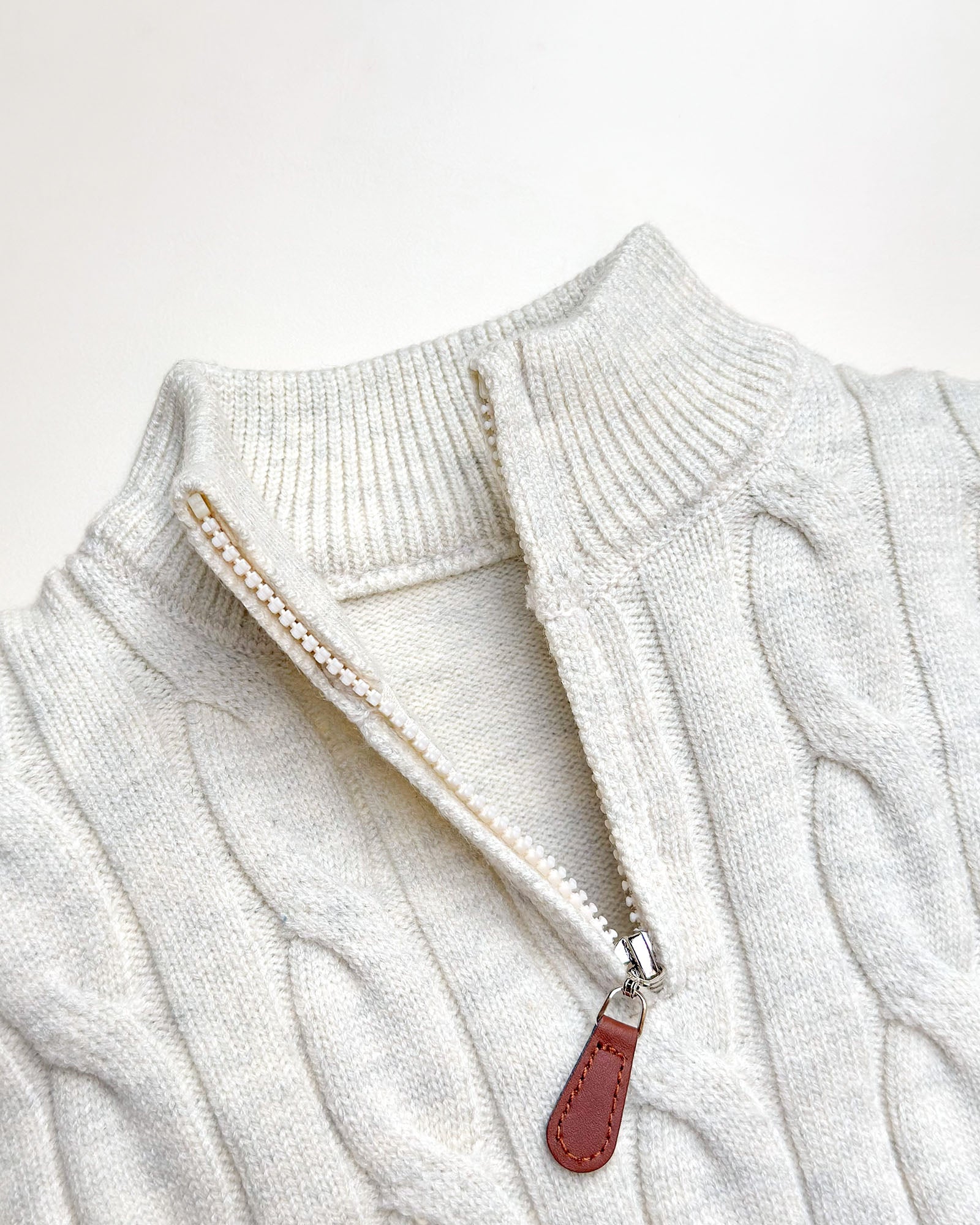 Crafted with a beautifully detailed cable-knit pattern and a soft neutral tone, this sweater promises a refined yet playful winter look. The half-zip neckline adds versatility—zip it up for extra warmth on chilly mornings or keep it open for a relaxed, stylish vibe.