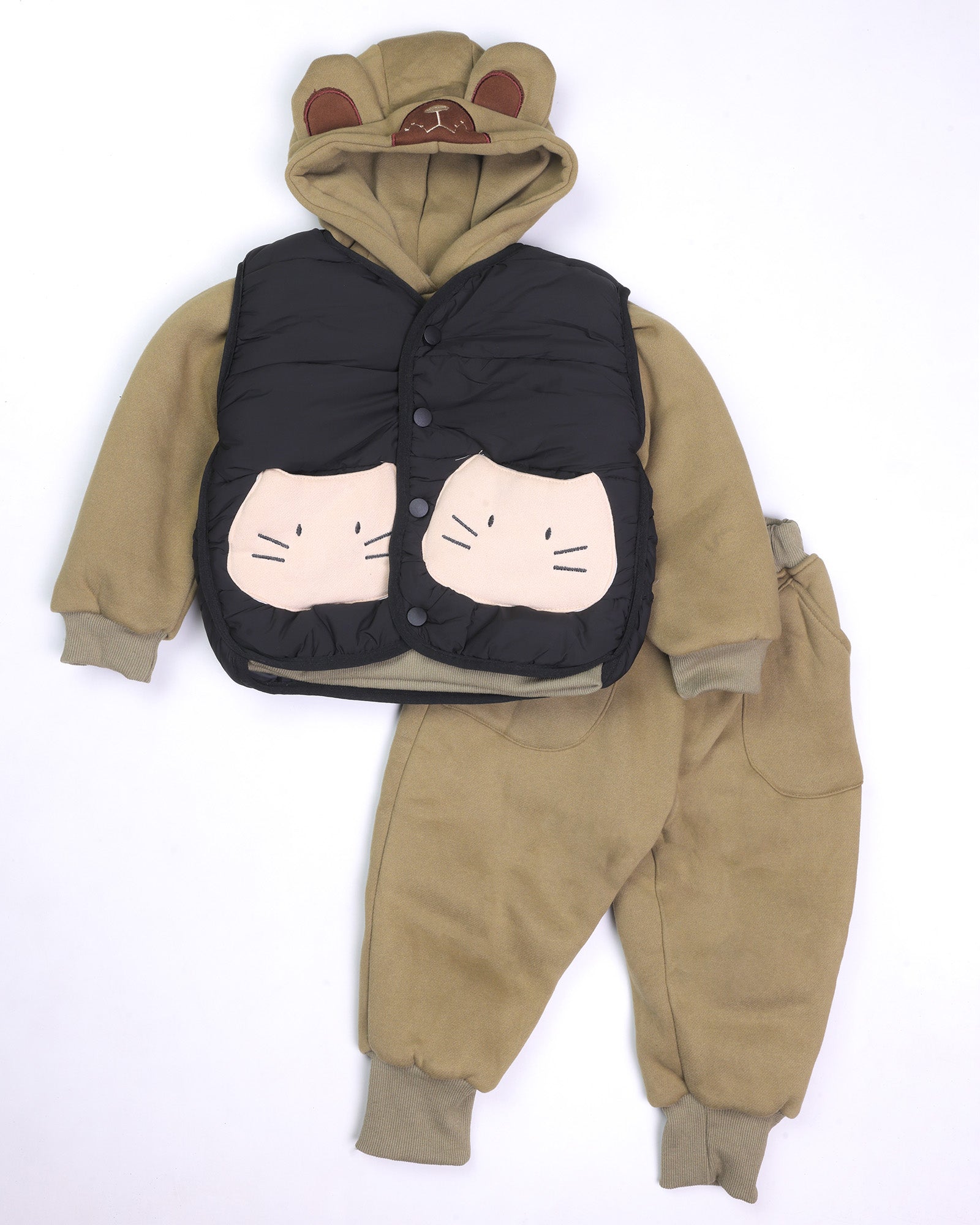 Designed for the little explorer who never stops moving, this ultimate 3-piece set is a masterclass in cozy layering. The set features a lush olive-toned fleeced hoodie with adorable 3D bear ears on the hood, perfectly paired with matching soft-knit joggers for head-to-toe comfort. To top it all off, the Midnight Black puffer vest adds a bold, sporty edge with its whimsical cat-face pocket appliques, making it the most "paws-ome" outfit in his winter wardrobe!