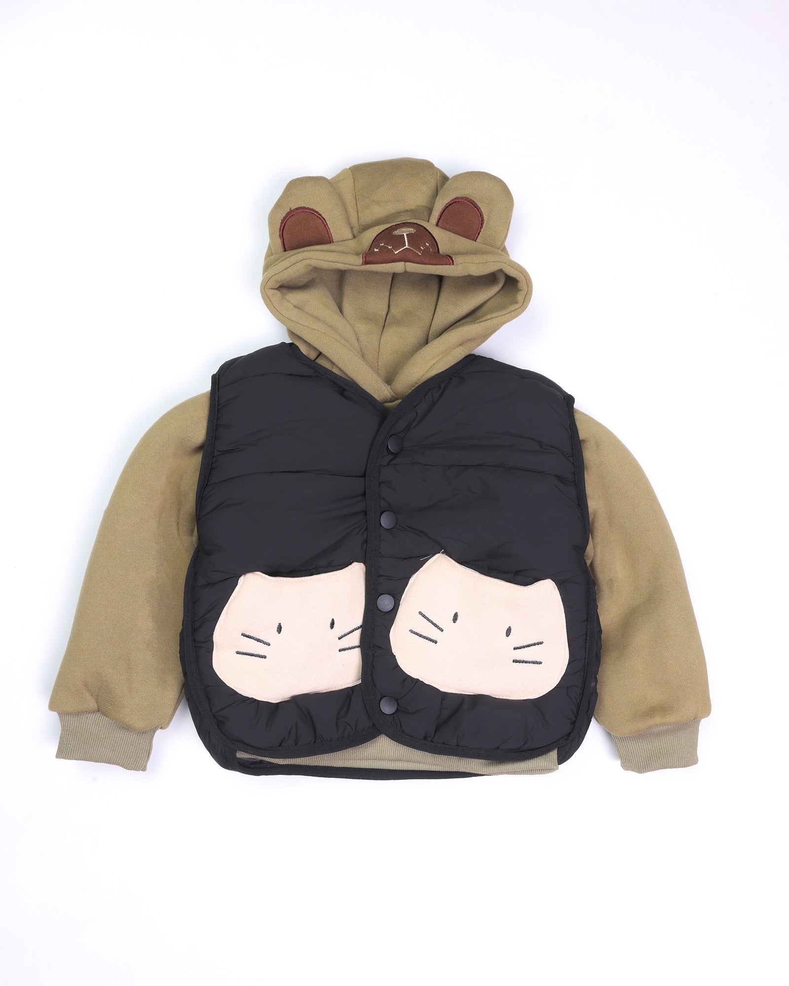 -3D Character Details – Features playful bear ears on the hood and sweet cat-face embroidery on the vest pockets.