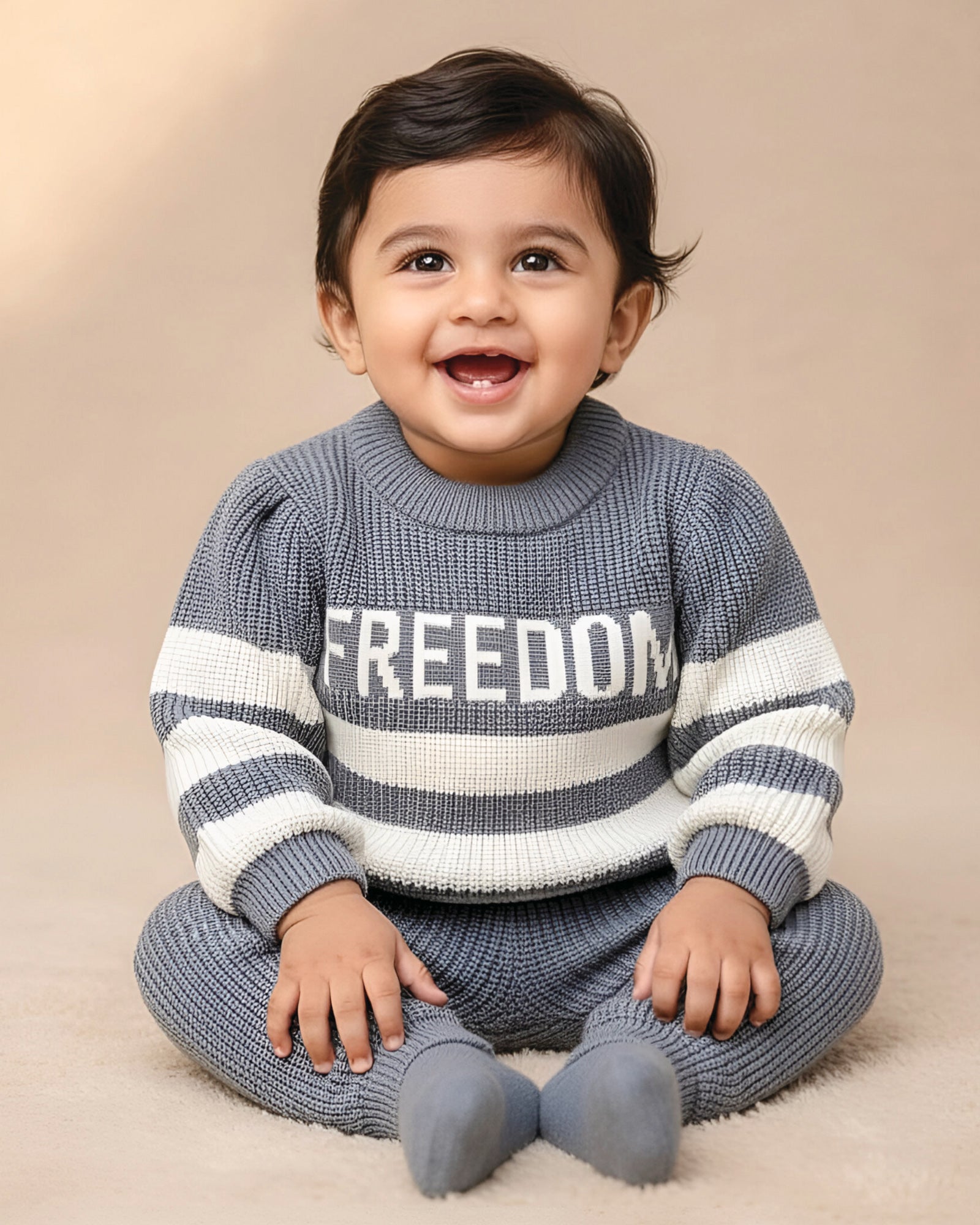 Wrap your little one in warmth, style, and comfort with our FREEDOM Knitted Co-ord Set! Designed for the season of snuggles, this set features a soft knitted sweater with bold FREEDOM lettering and matching bottoms, making it the ultimate winter essential for your trendsetting kiddo.
