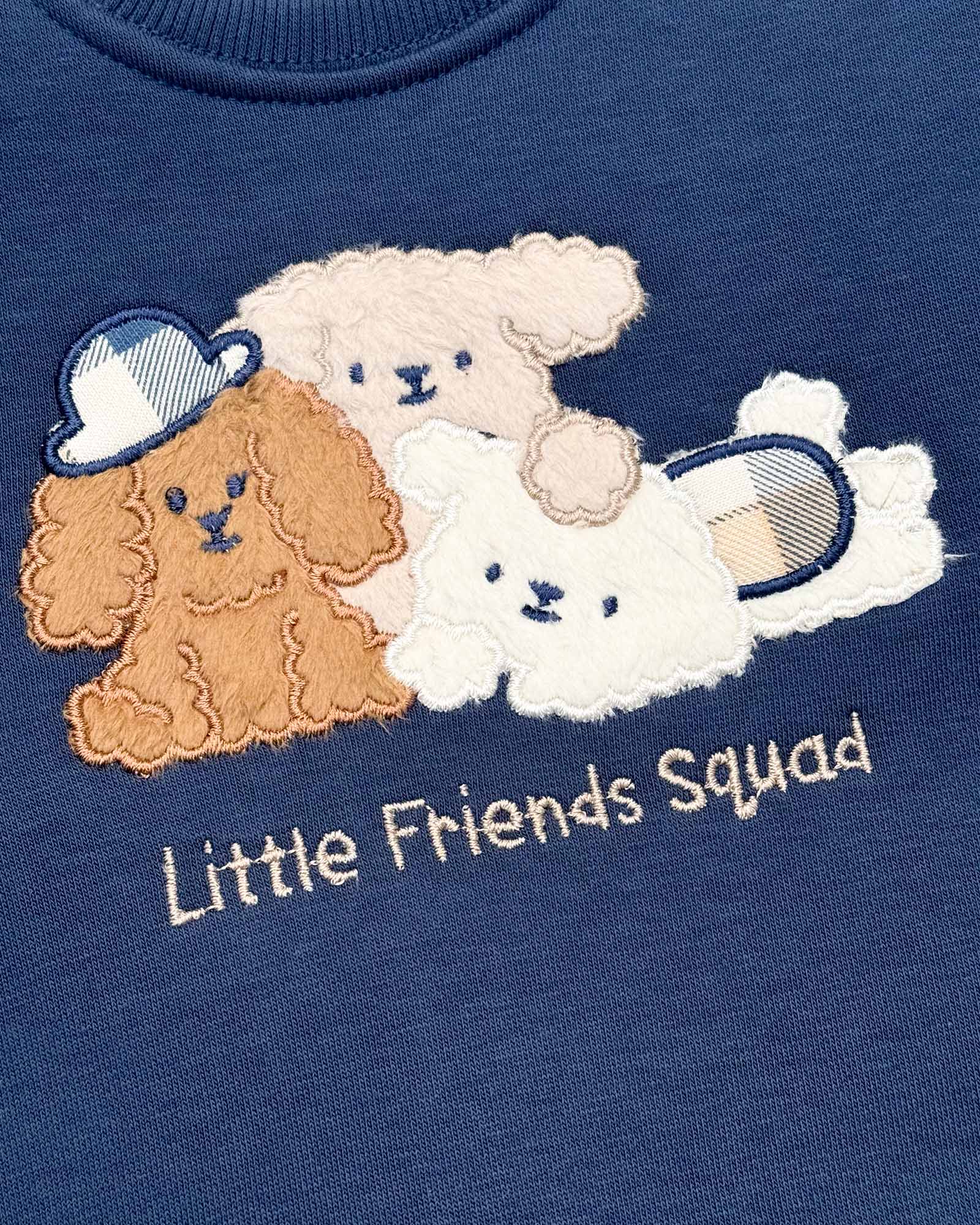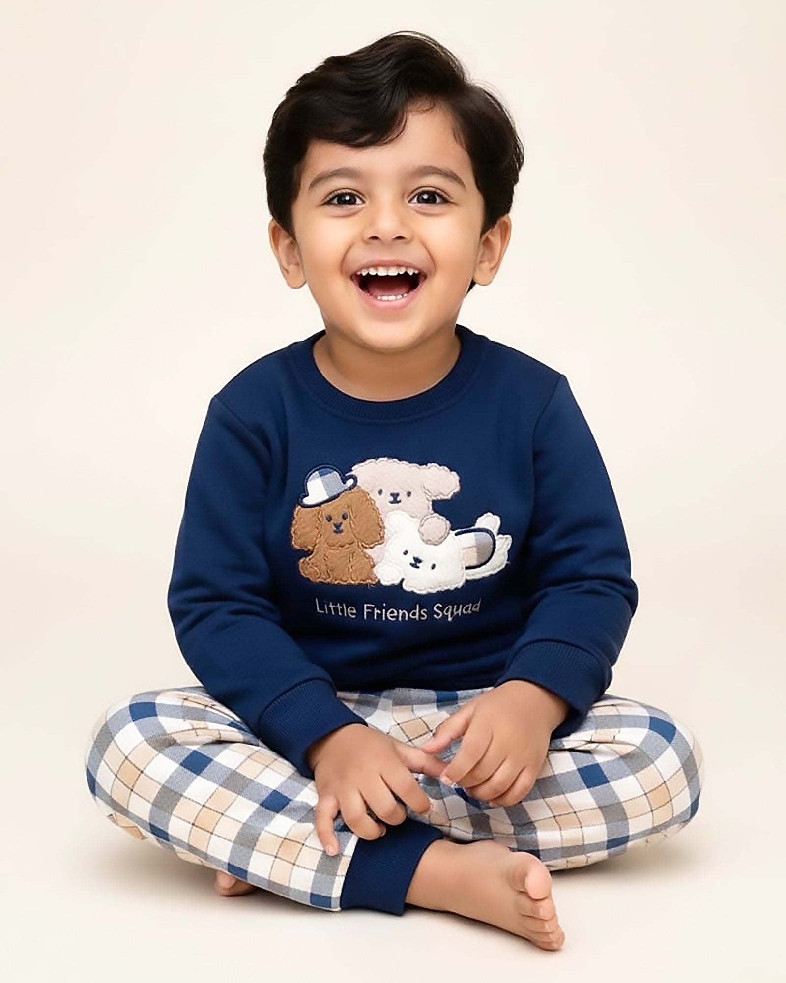 Perfect for your little one’s daily adventures, this set features the most adorable trio of fluffy pup appliques with "Little Friends Squad" embroidery. The rich navy blue / beige sweatshirt is paired with trendy checkered joggers in a classic blue and beige palette, making it a standout choice for the season. 🧥💙