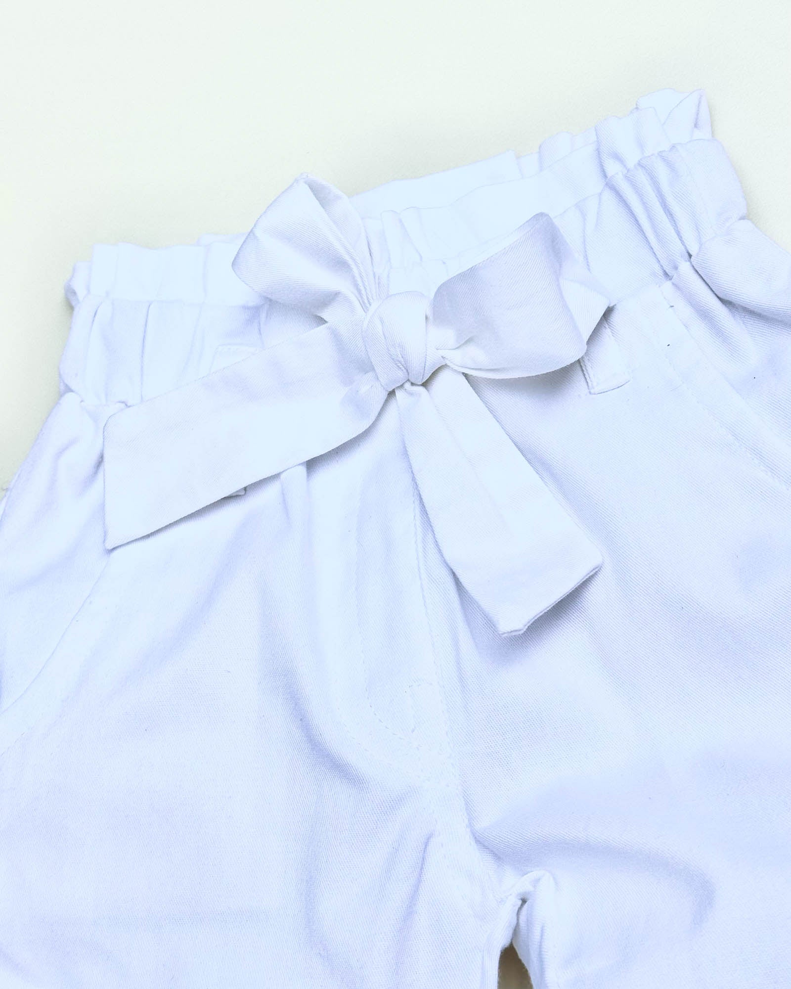 - Easy-to-wear white pants with bow-tie elasticated waist.