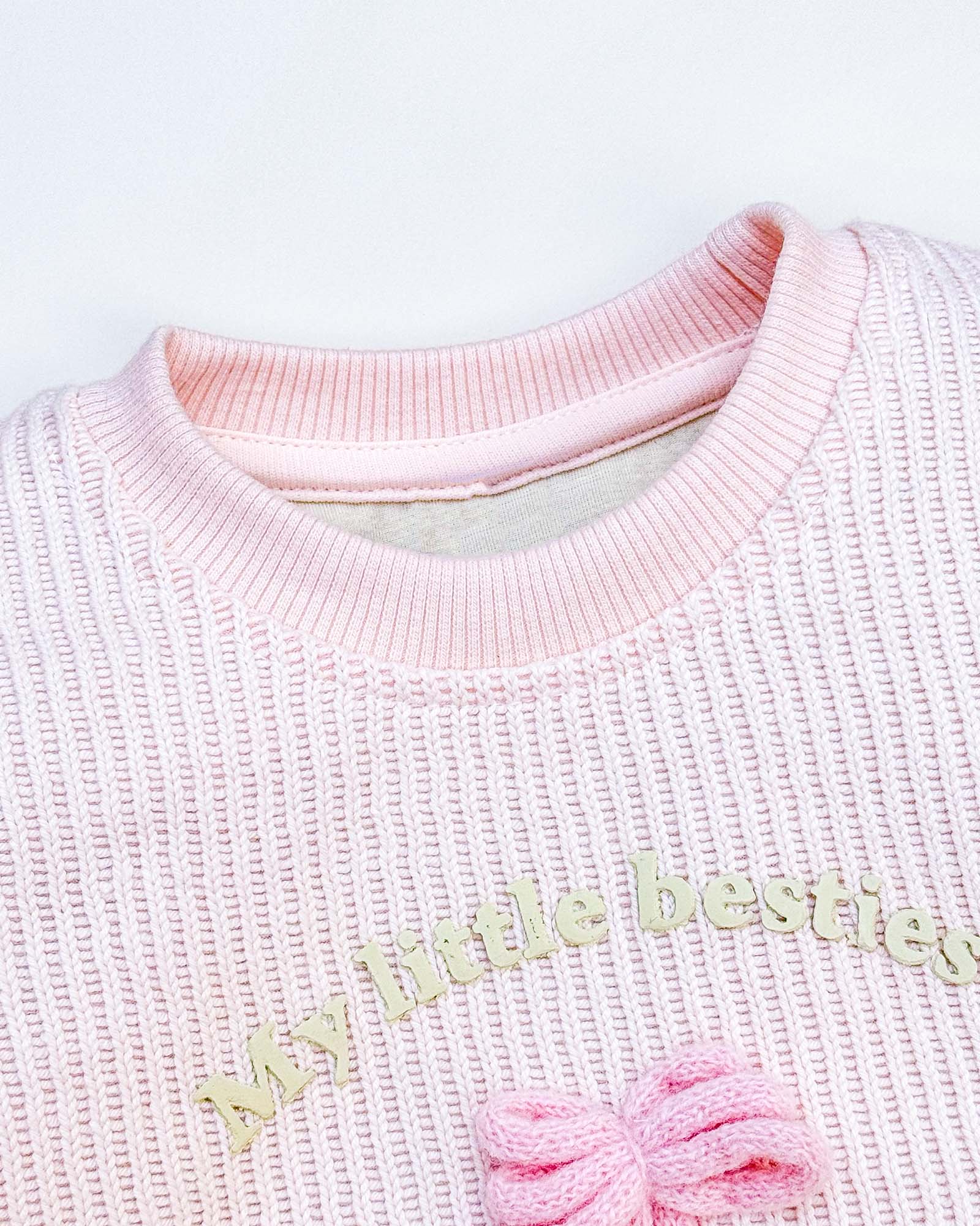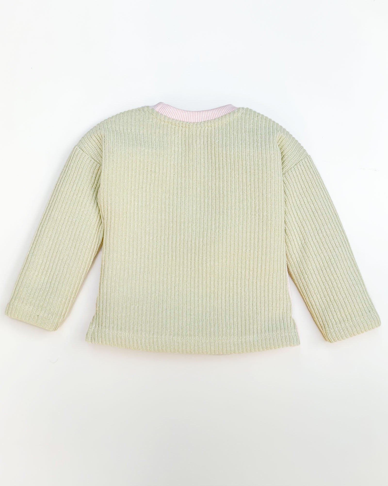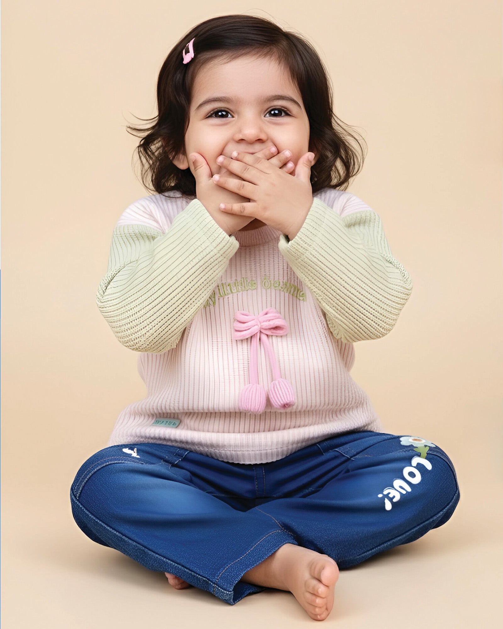 The pastel-hued top with delicate knit texture, adorable bow detailing, and full sleeves pairs perfectly with comfy denim bottoms — making it a must-have outfit for playdates, park strolls, or family outings. Cute, cozy, and oh-so-lovable! 💕