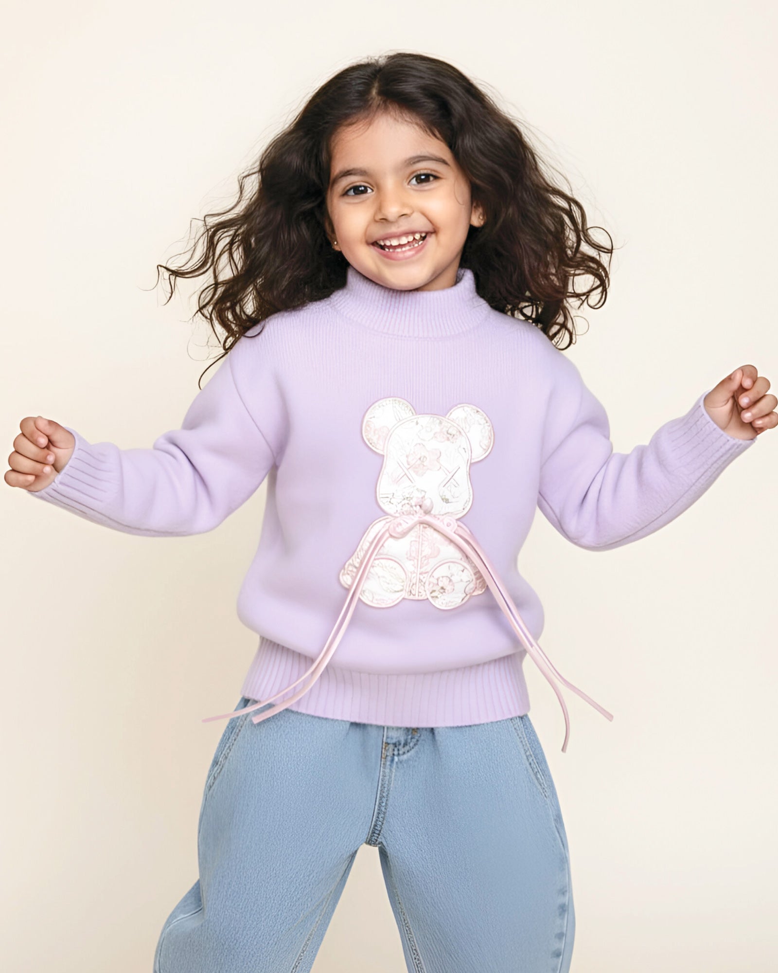 Make every day extra cozy and cute with our Full-Sleeve Bear Embroidered Sweater in Lavender Purple — a dreamy blend of warmth, comfort, and style! The soft lavender hue brings a magical winter vibe, while the adorable embroidered teddy bear patch with ribbon tie details adds the perfect touch of sweetness your little one will love.