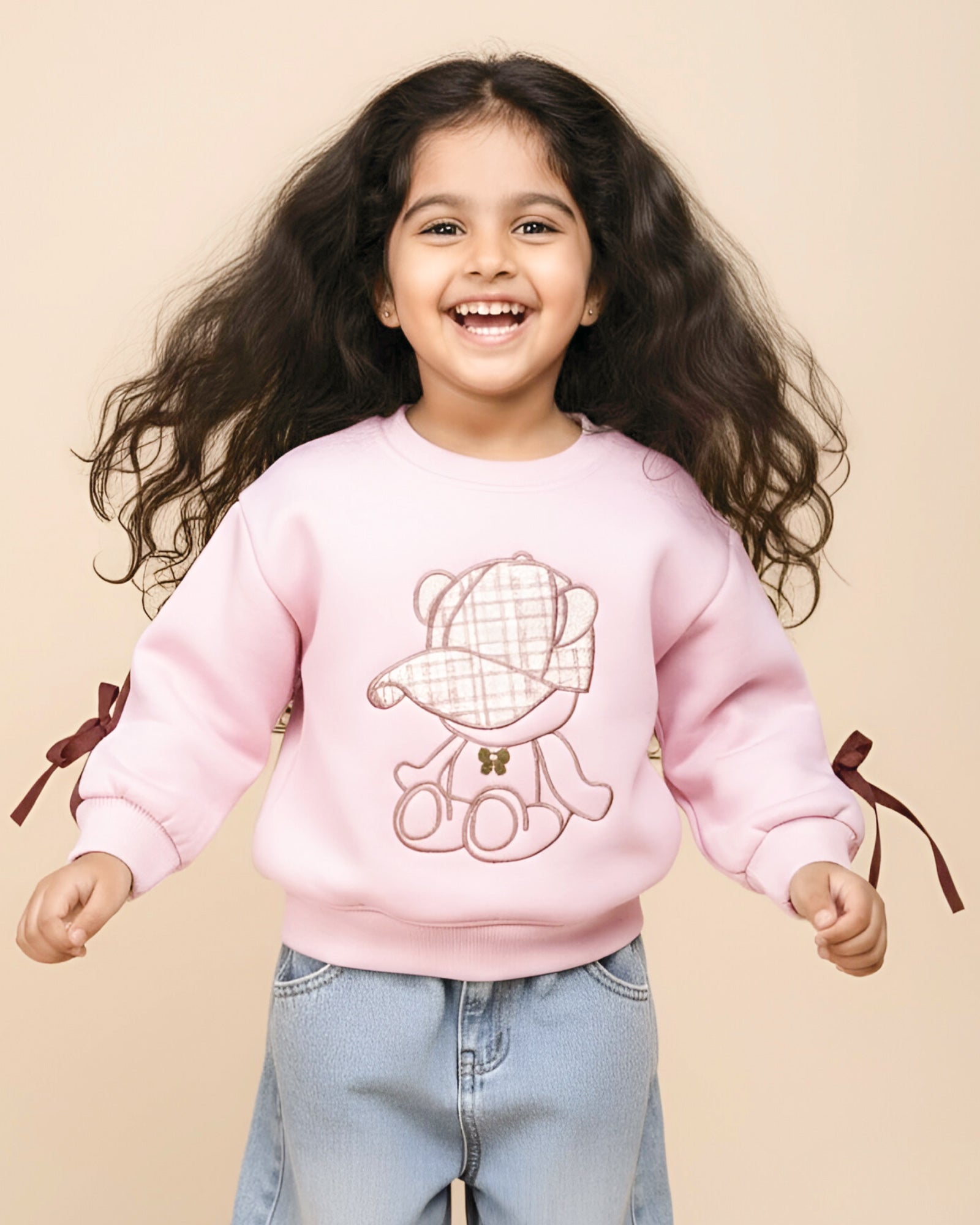 Wrap your little fashionista in adorable comfort and warmth with our Full-Sleeve Teddy Bear Embroidery Sweatshirt. Designed with love, this cozy sweatshirt features an ultra-soft fabric, a playful teddy bear embroidery wearing a chic pink cap, and pretty pink bow details on the sleeves for that extra charm.