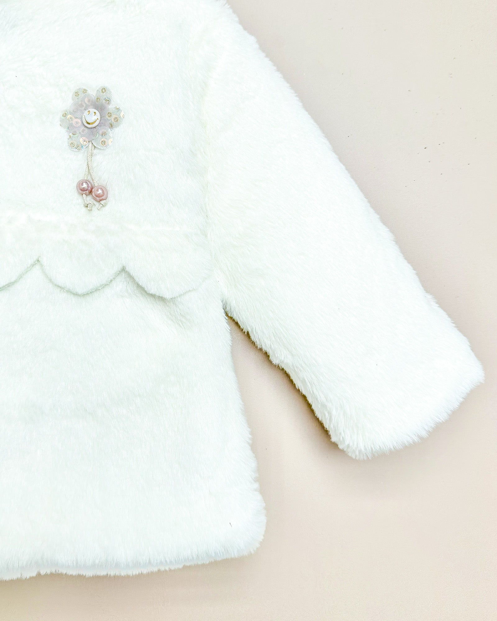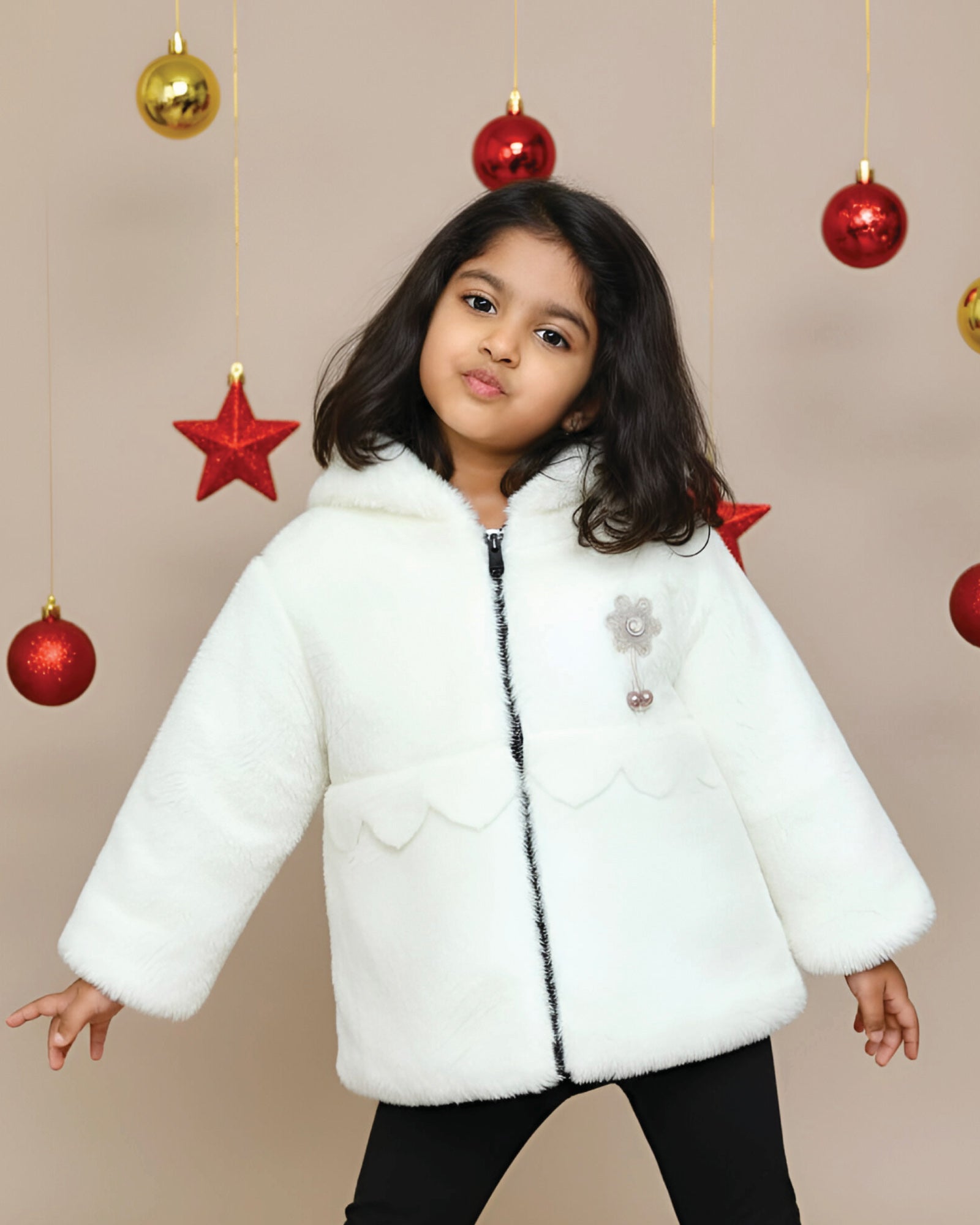 Bring on the cozy feels with our Fur Full-Sleeve Jacket – Snow, a dreamy winter essential that blends warmth, elegance, and playful charm! This soft-as-cloud jacket is designed in a luxurious snow-white faux fur fabric that feels like a gentle hug. Adorned with a delicate flower applique brooch and a scalloped edge detail, it’s perfect for festive celebrations, cozy outings, or those adorable twirl-worthy photo moments!
