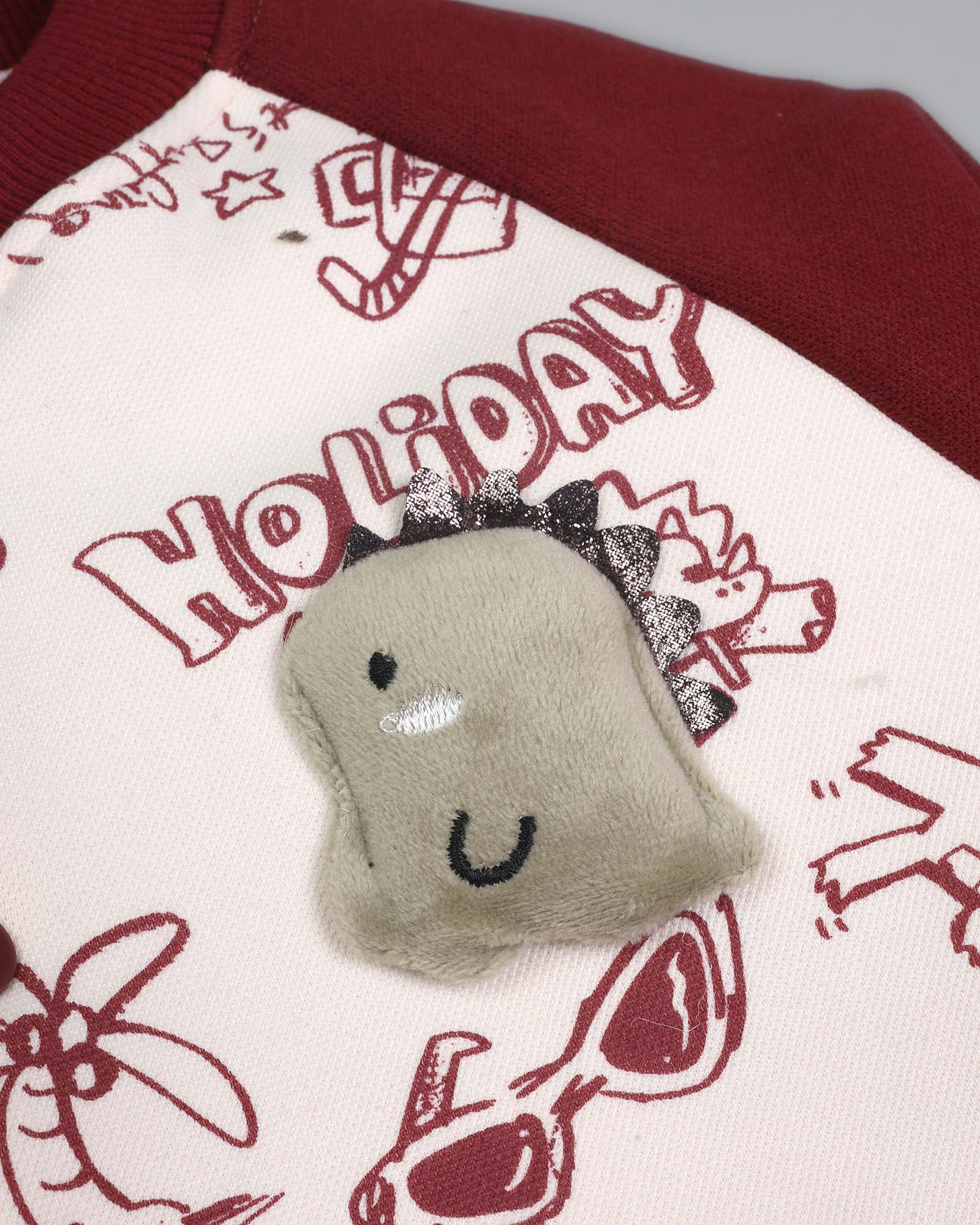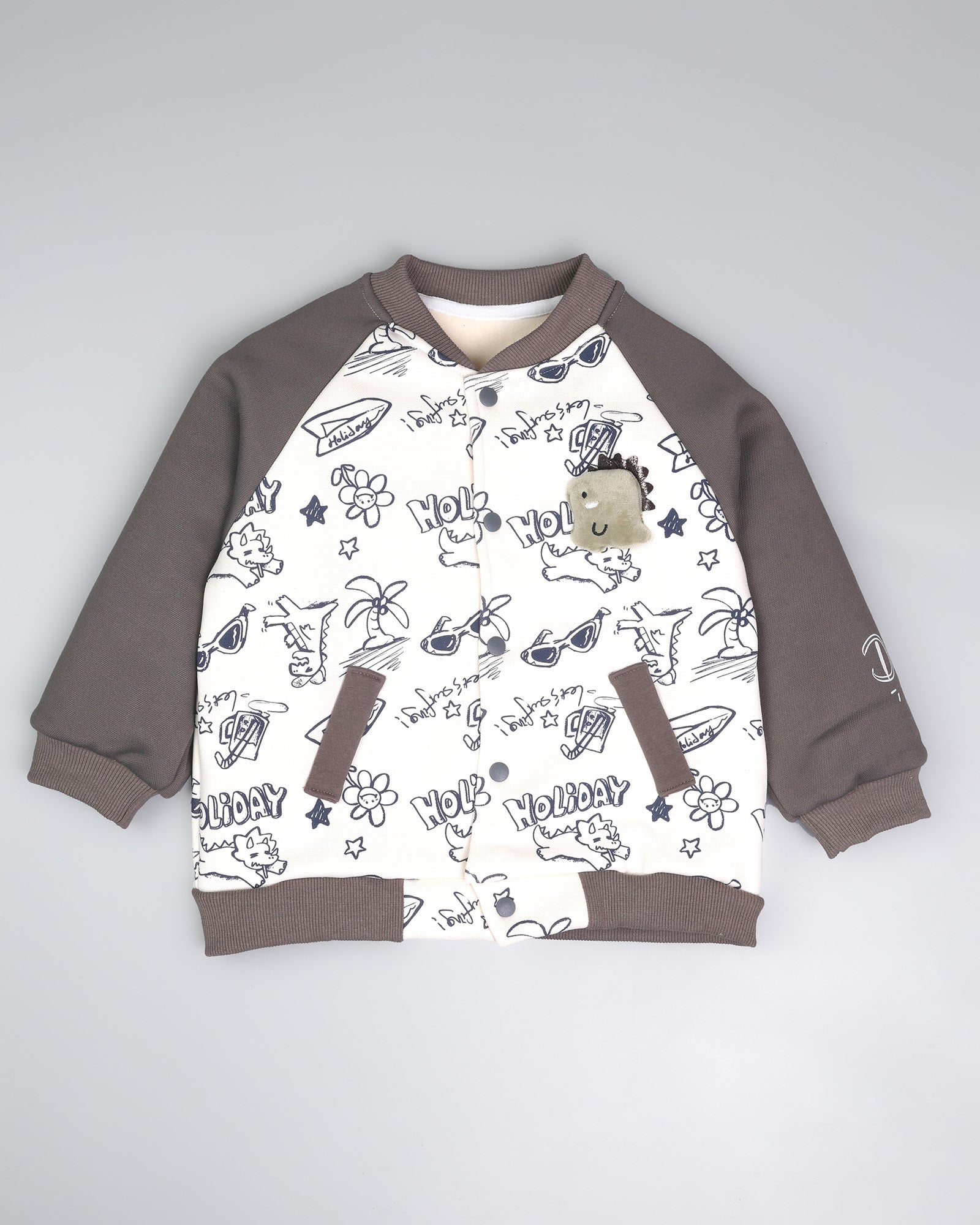 Designed for little explorers who live for fun, this jacket brings a vibrant, artistic energy to your baby's winter wardrobe. Featuring a crisp white body covered in playful "Holiday" graffiti-style sketches—including flowers, sunglasses, and happy dinos—it is perfectly framed by rich wine-red sleeves that make every outfit pop! 🧥❤️