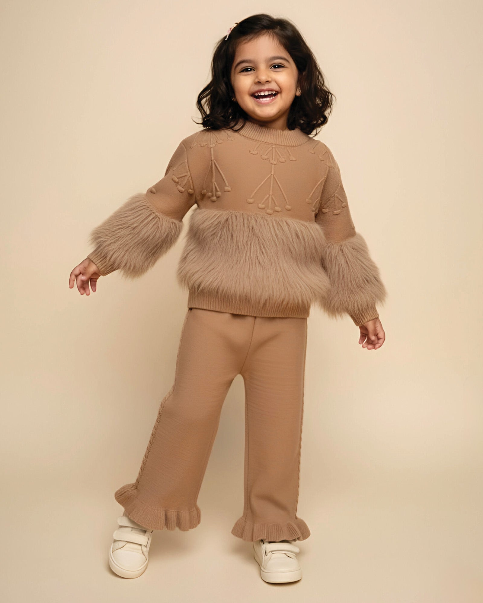 Let your little one shine through the winter season with our Knitted Textured Sweater Co-Ord Set with Fur Details — the perfect blend of comfort, cuteness, and chic style! Designed in a warm walnut shade, this co-ordinate set brings together soft knits, playful textures, and luxurious faux fur details that your mini trendsetter will absolutely adore.