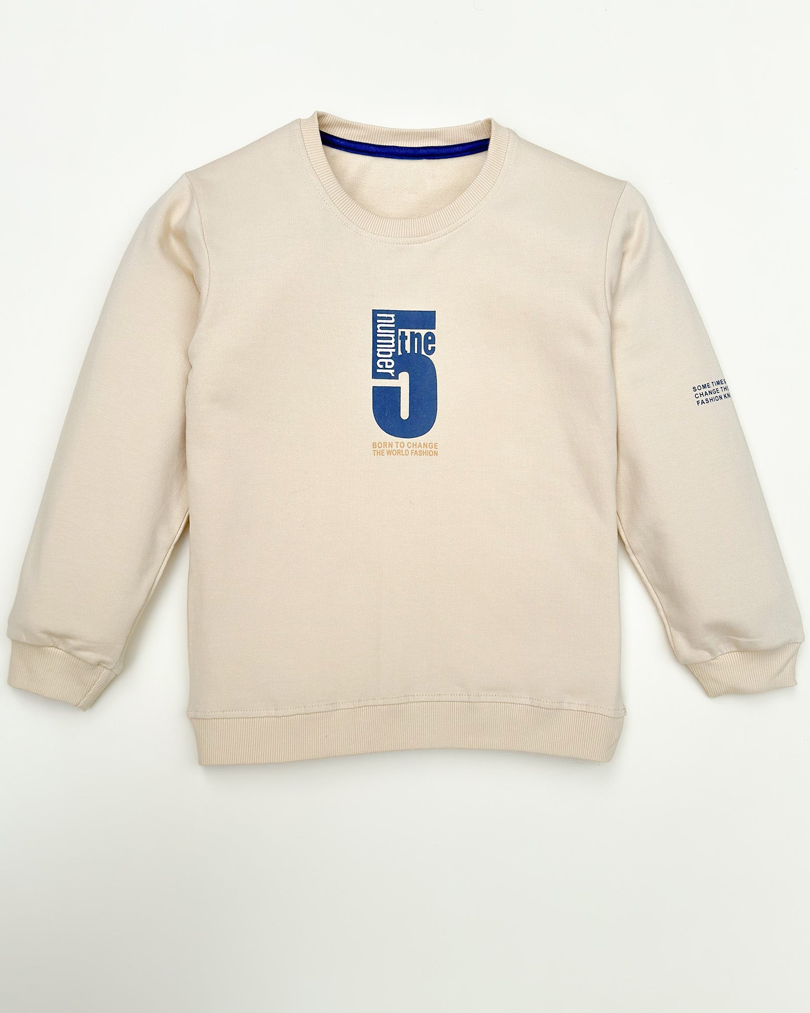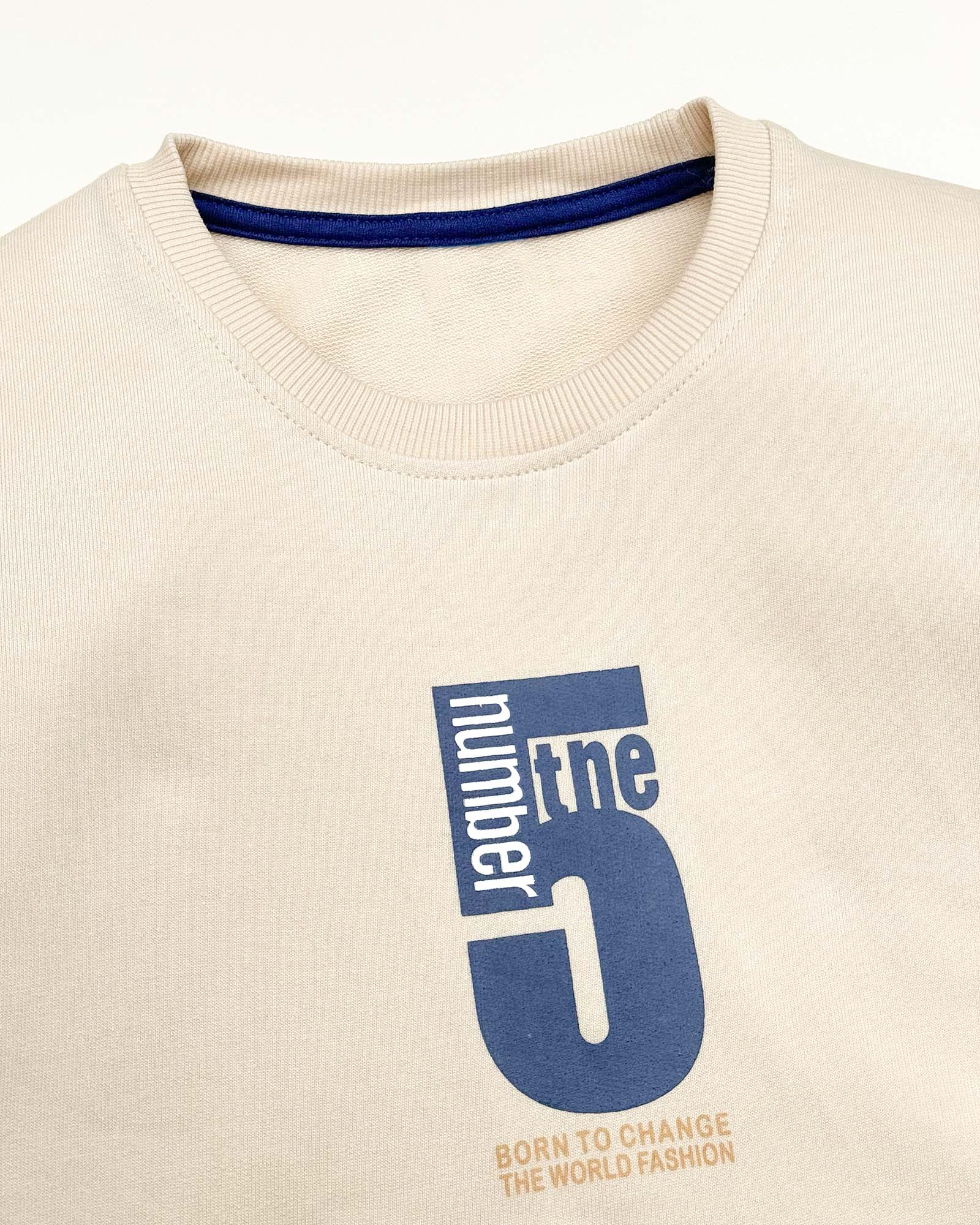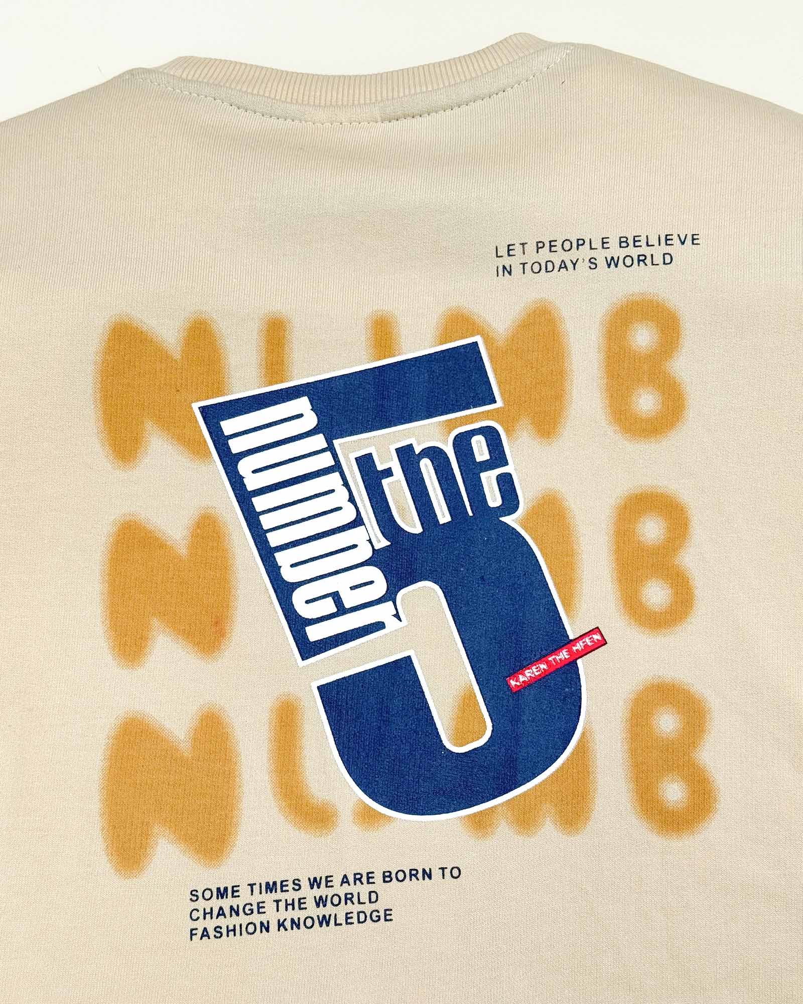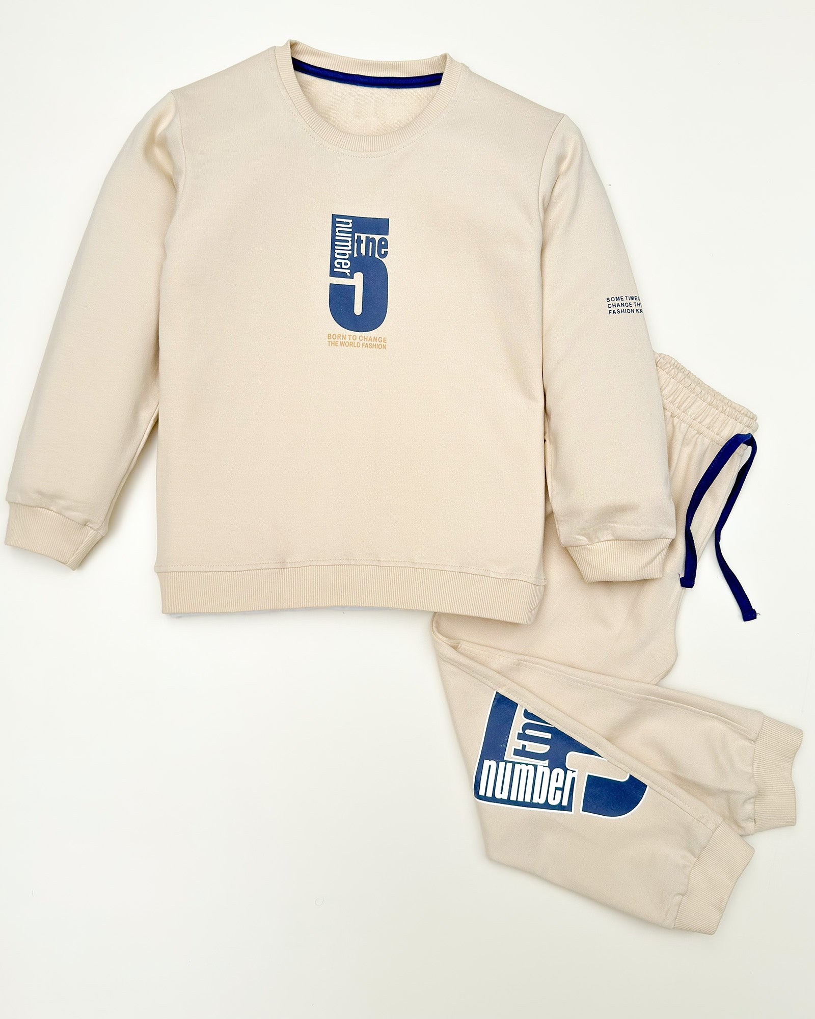 The chic beige sweatshirt features a bold No.5 graphic print, adding a cool sporty vibe, while the matching joggers include coordinating print details and a comfy elastic waist with contrast drawstrings. This set is designed for everyday fun—perfect for outings, playdates, preschool days, and lazy Sundays at