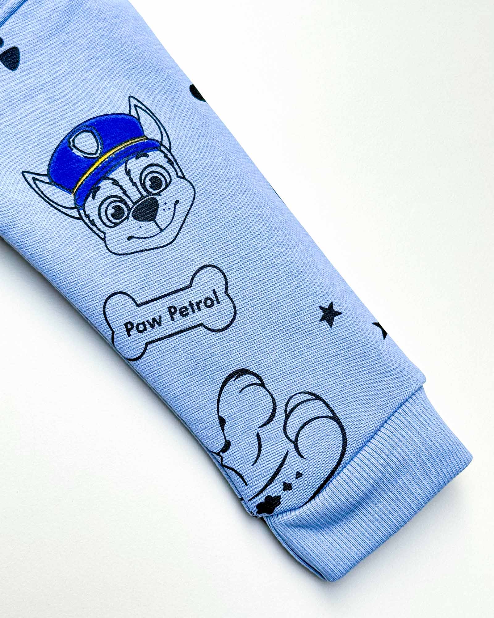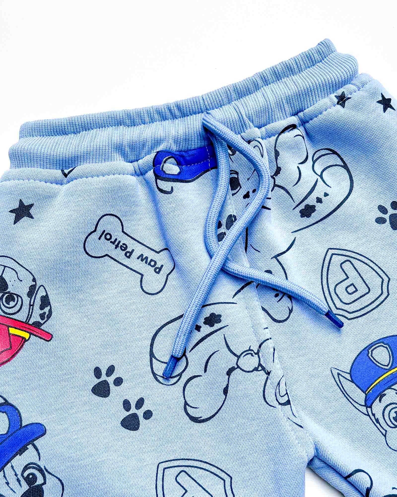 The cheerful all-over Paw Patrol print brings their favorite heroes — Chase, Marshall, Rubble, and friends — to life, while the soft elastic waistband, drawstring closure, and ribbed cuffs make sure your little explorer stays comfy through every move.