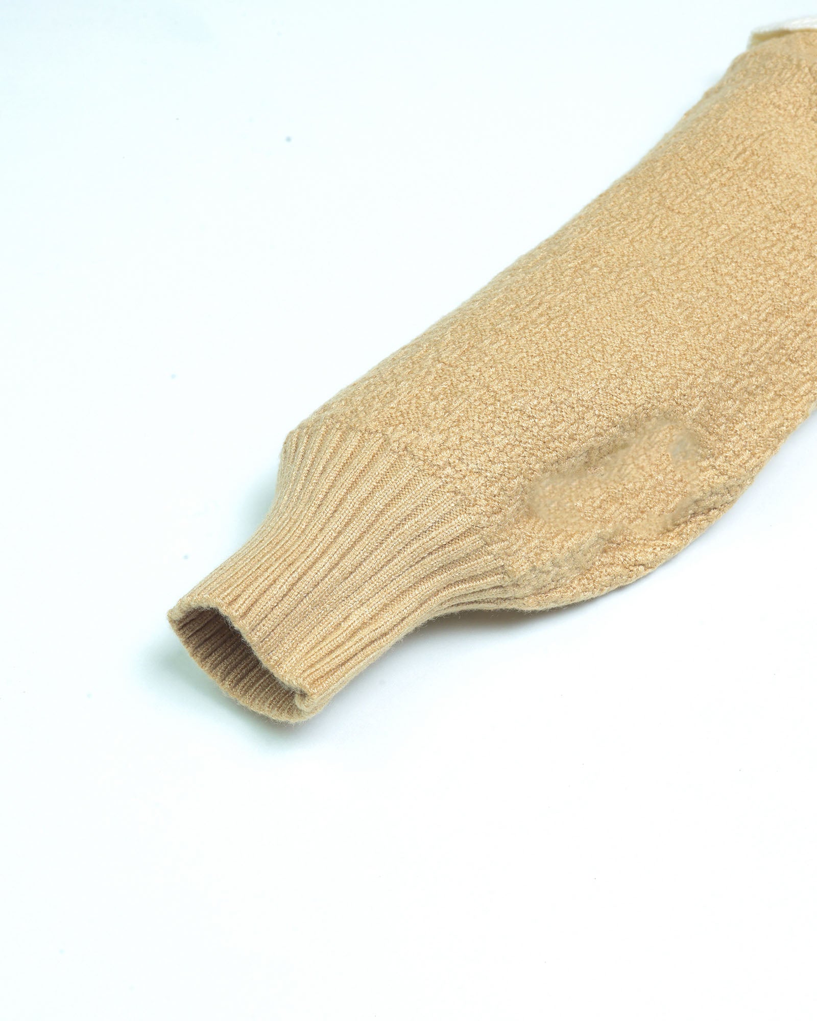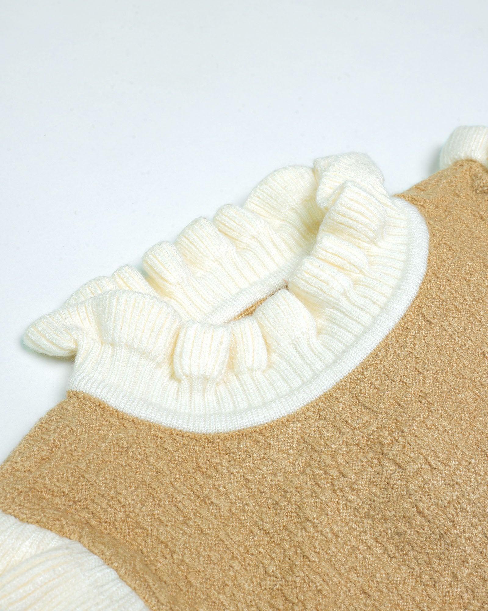 Designed for the little one who loves a touch of vintage charm, this dress is the ultimate blend of warmth and whimsy. The soft, knitted fabric in a beautiful coffee-cream tone is accented with delicate white ruffles along the high neck and shoulders, creating a look that is as elegant as it is cozy. With its sweet 3D flower appliques and classic cable-knit textures, this frock is perfect for everything from holiday tea parties to festive family gatherings