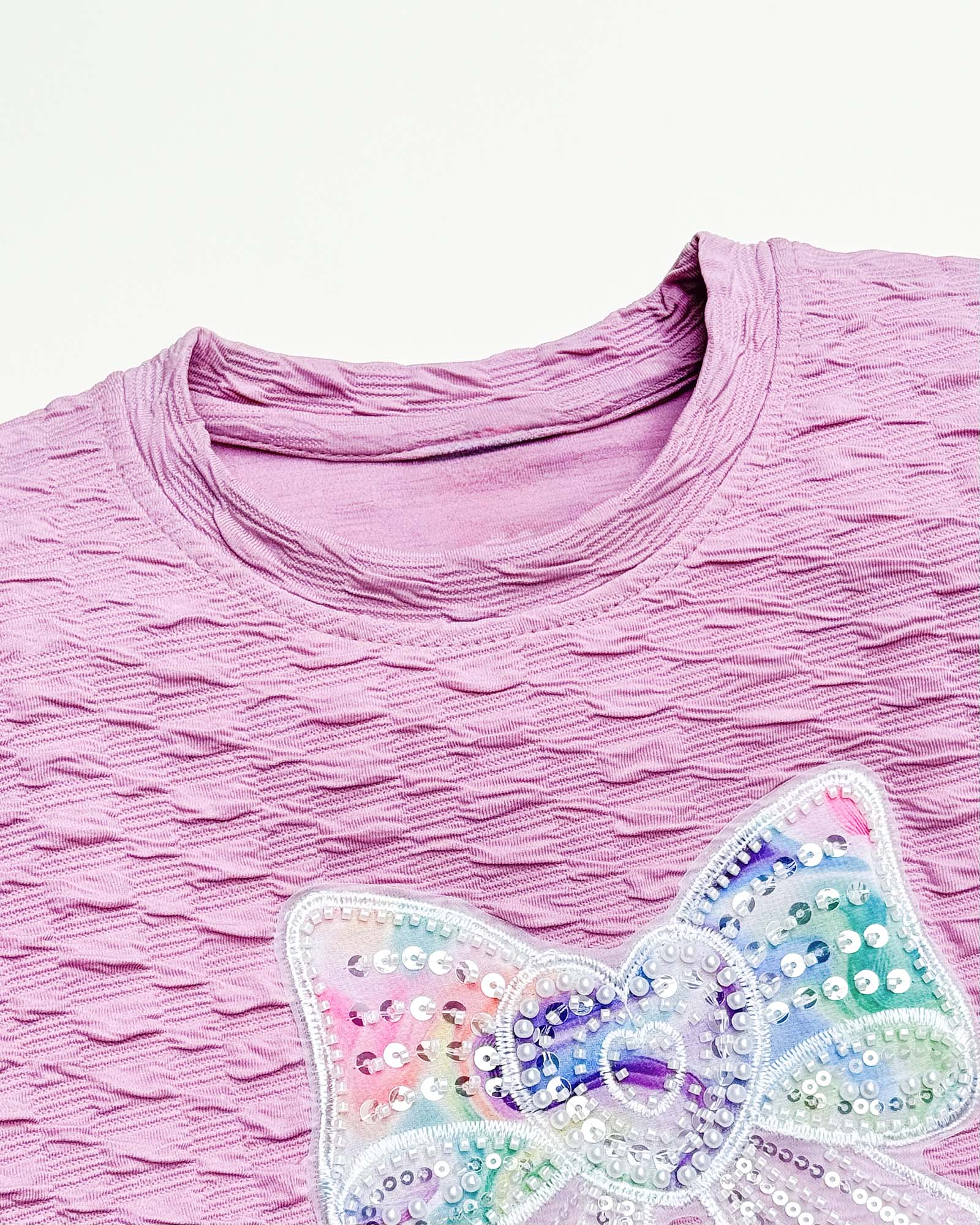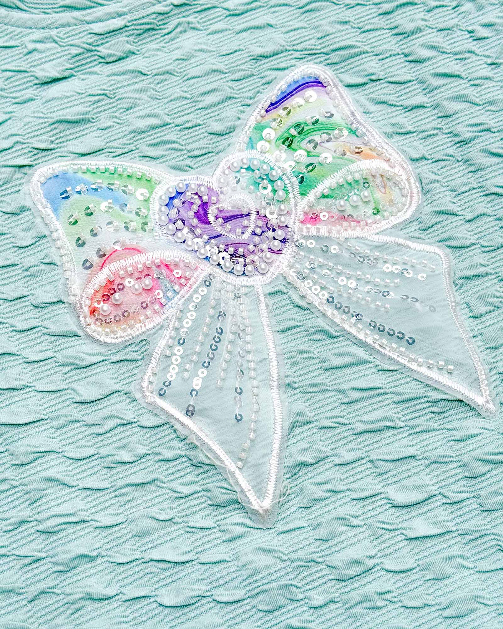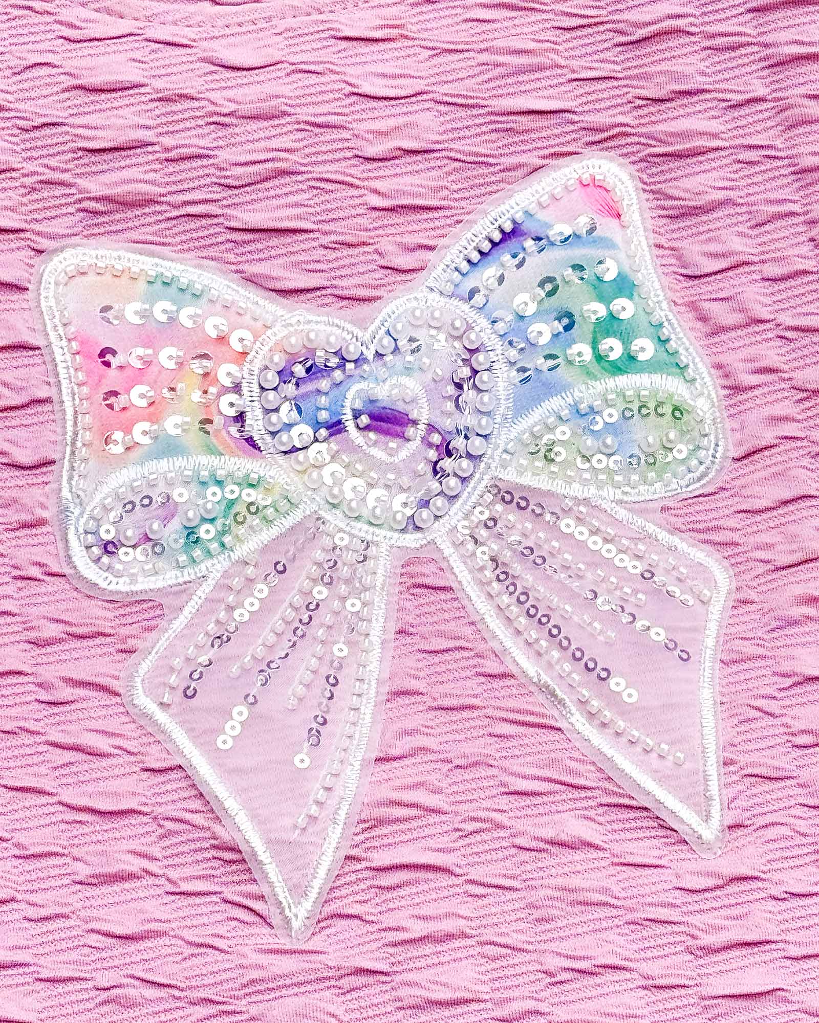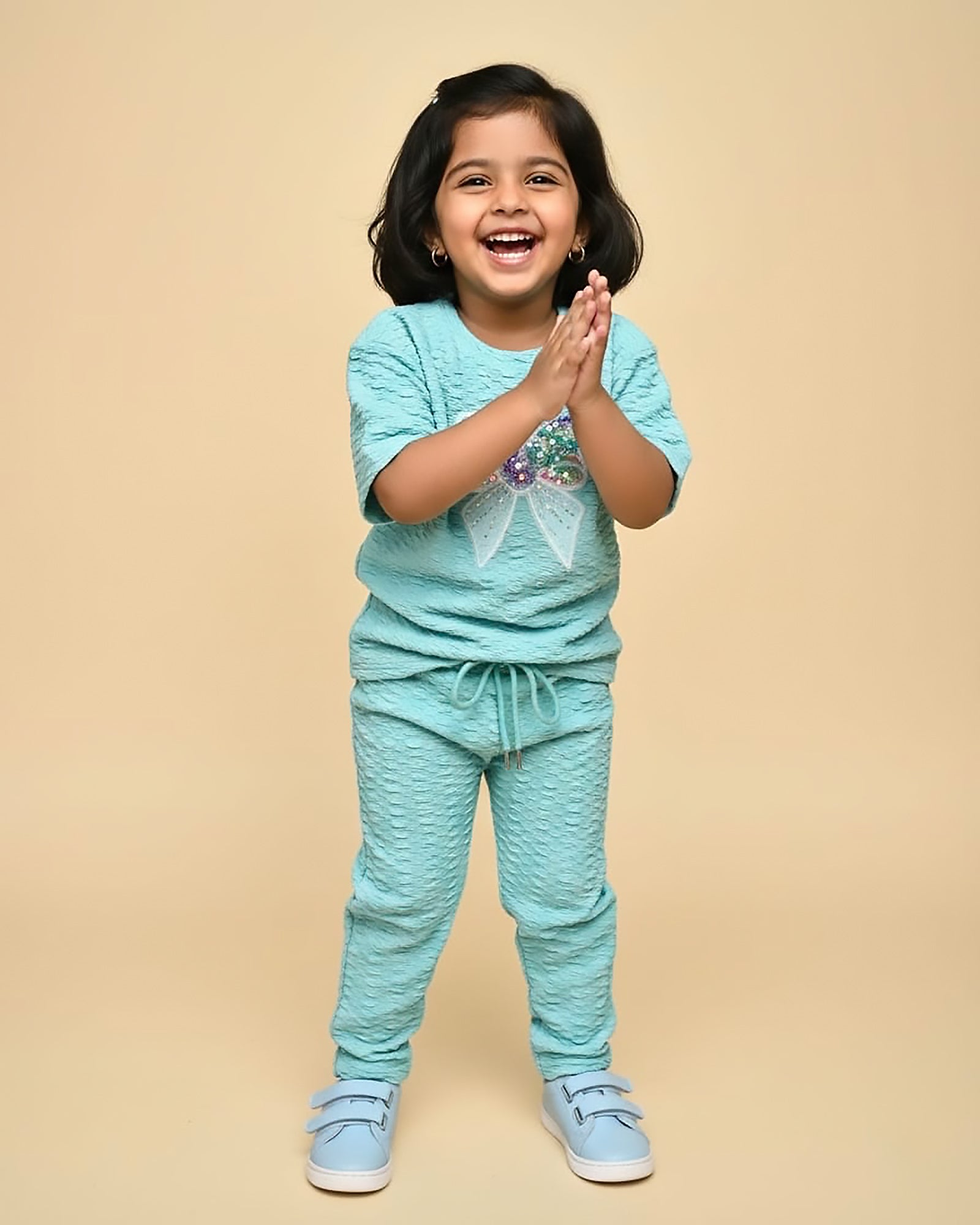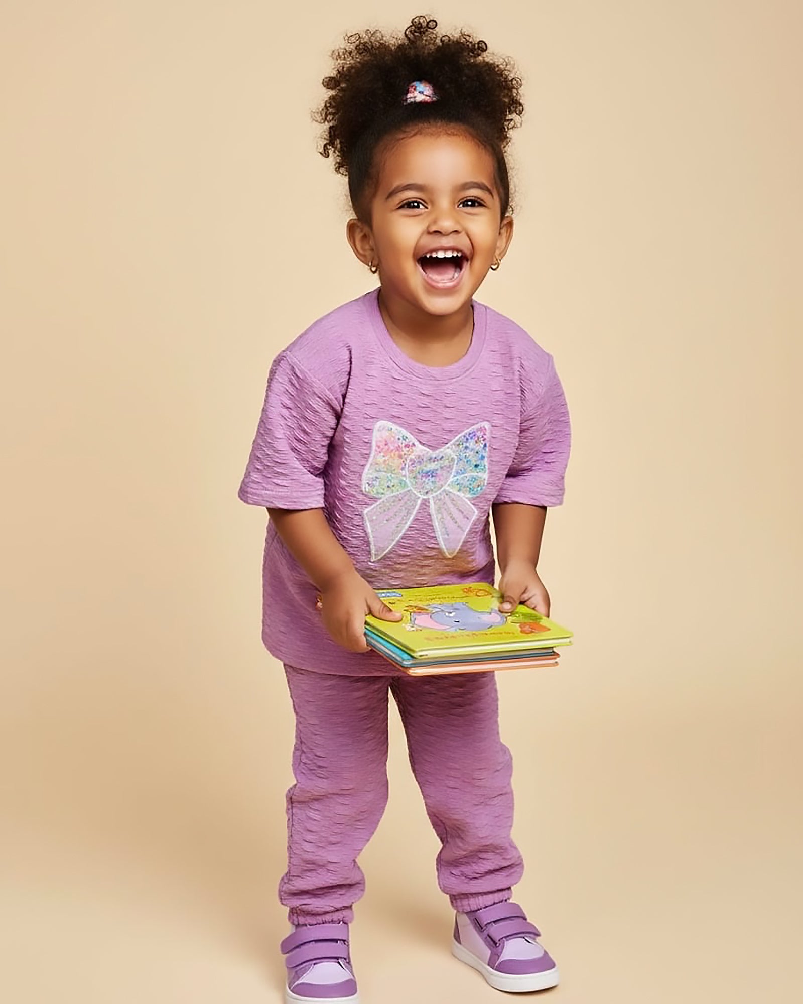 The top features a trendy rainbow sequin bow patch that adds a pop of sparkle, while the matching palazzo pantscome with a comfortable elastic waist and drawstring for a perfect fit. Whether it’s a birthday party, a family outing, or a playdate, this co-ord set makes dressing up an effortless affair.