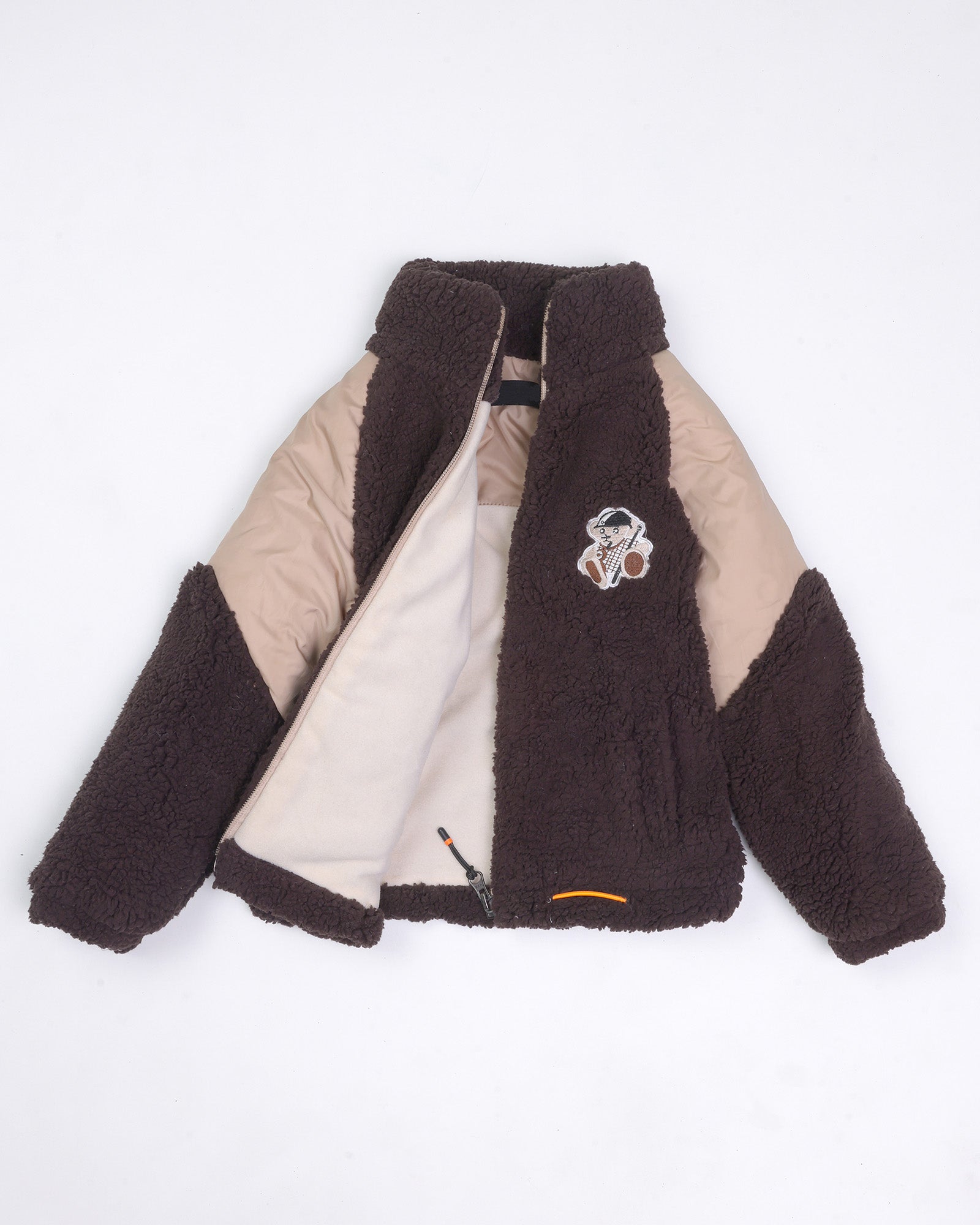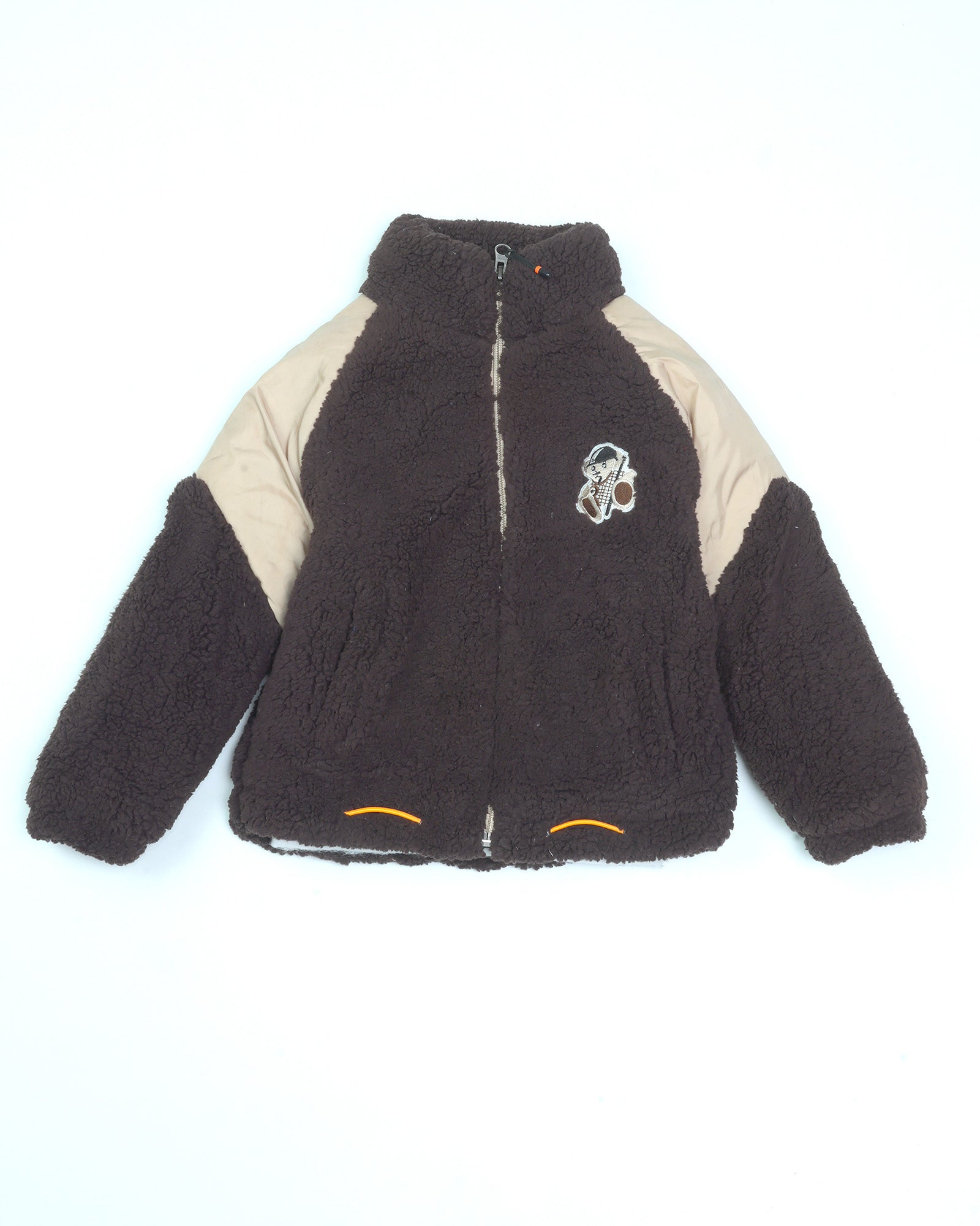 Designed for the little explorer who refuses to let the cold slow them down, this jacket is a masterclass in texture-blocking. It features a rich chocolate-toned sherpa fleece body that is incredibly soft to the touch, paired with contrasting cream puffer-style sleeves for a modern, sporty silhouette. The playful embroidered character on the chest adds that signature boutique charm, while the bright orange toggle accents provide a pop of high-visibility fun!