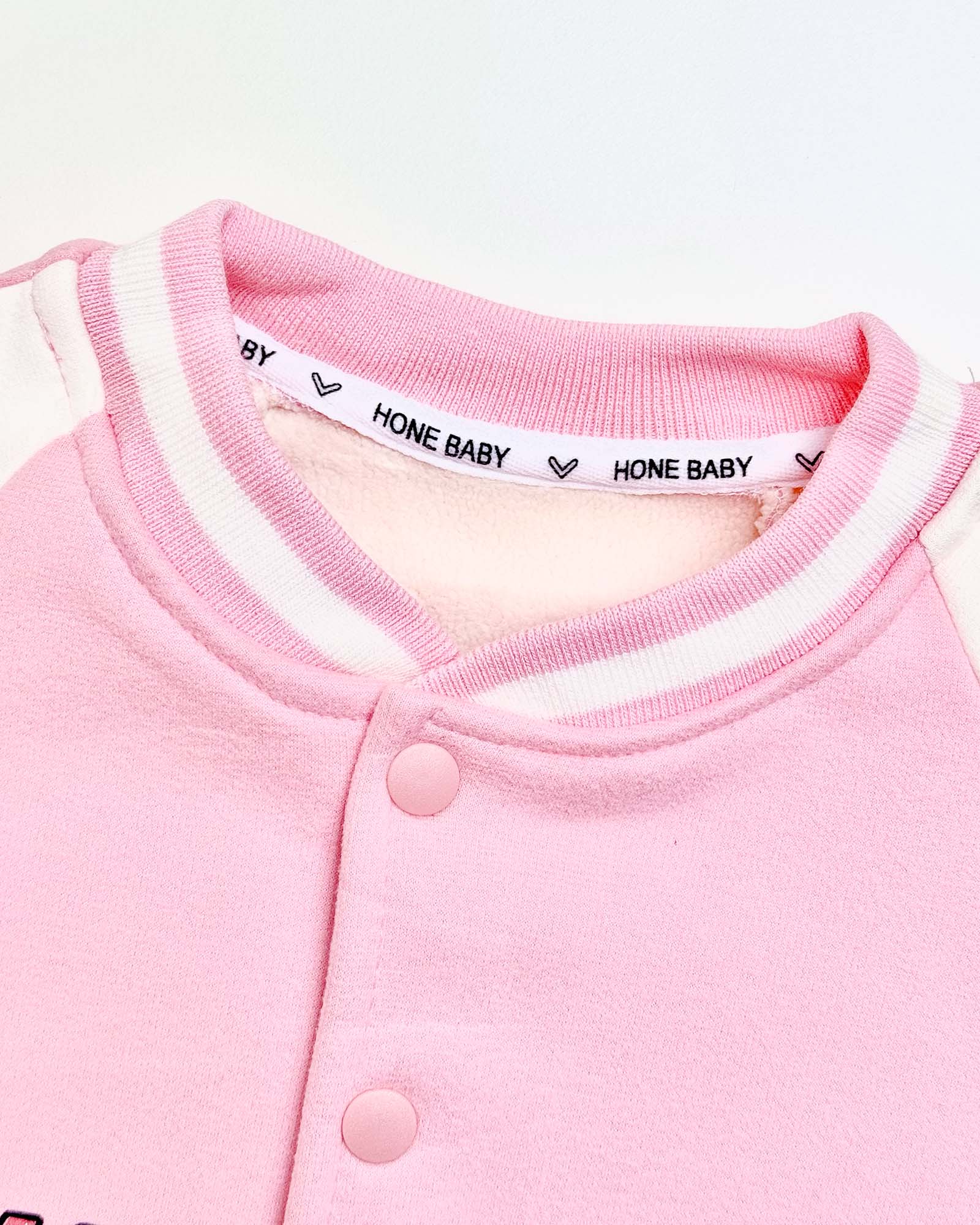 Give your little trendsetter a cozy yet stylish winter essential with our Soft Textured Full-Sleeve Graphic Printed Jacket in Pink. Perfectly blending comfort, warmth, and street-smart style, this varsity-inspired jacket is designed to keep your kid snug and looking effortlessly cool all season long.