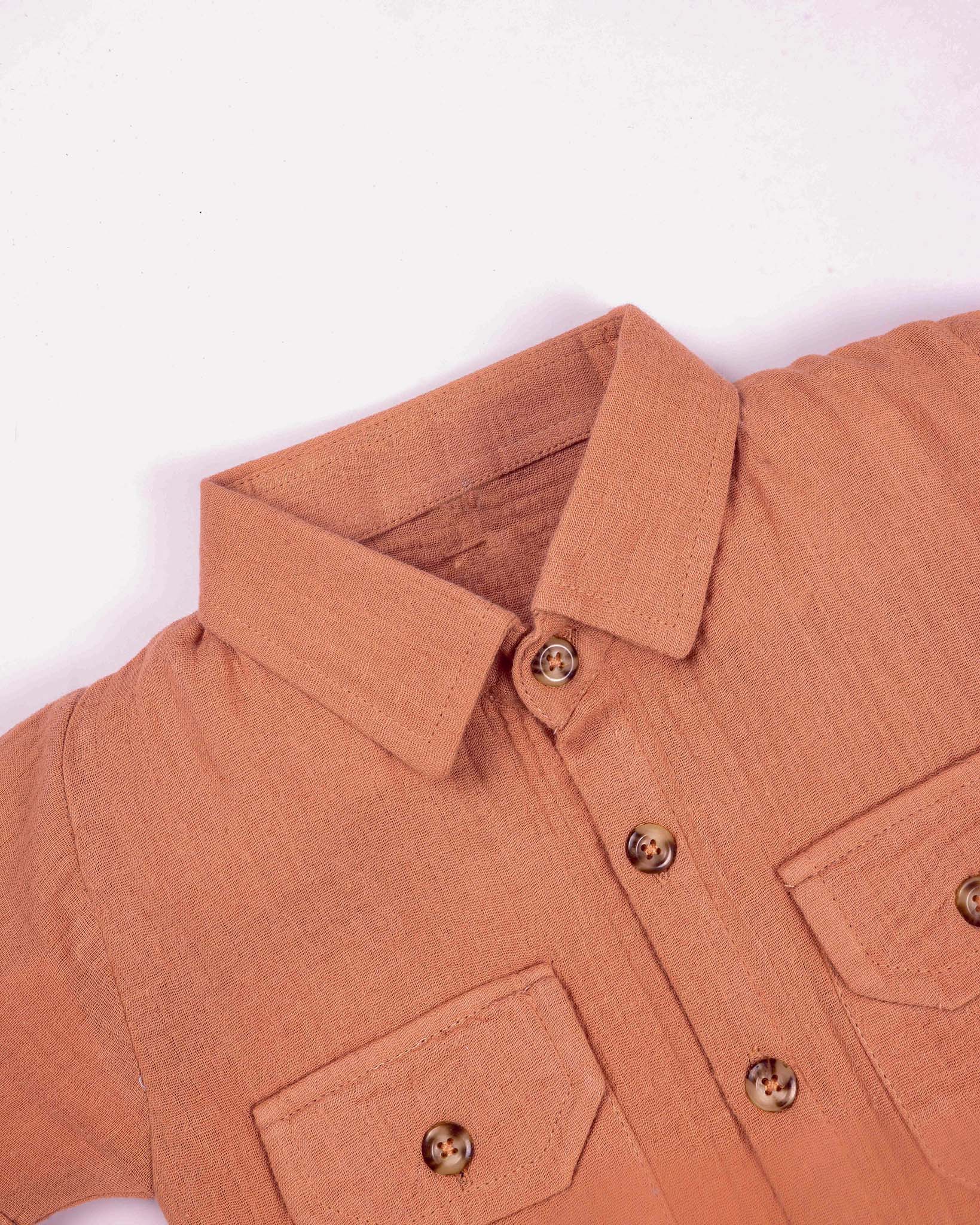 Elevate your baby's everyday wardrobe with our Solid Popcorn Textured Muslin Shorts Co-ord Set, a total mood-booster that perfectly blends earthy elegance with modern boutique comfort. This set is specifically designed for little explorers who need ultimate breathability, combining a sophisticated button-down shirt with matching cargo-style shorts in a warm, sun-kissed ochre hue. We love how the unique "popcorn" muslin texture adds a playful, tactile element to the outfit, while the 100% premium cotton fabric ensures your baby stays cool, happy, and comfortable during those sunny afternoon adventures.