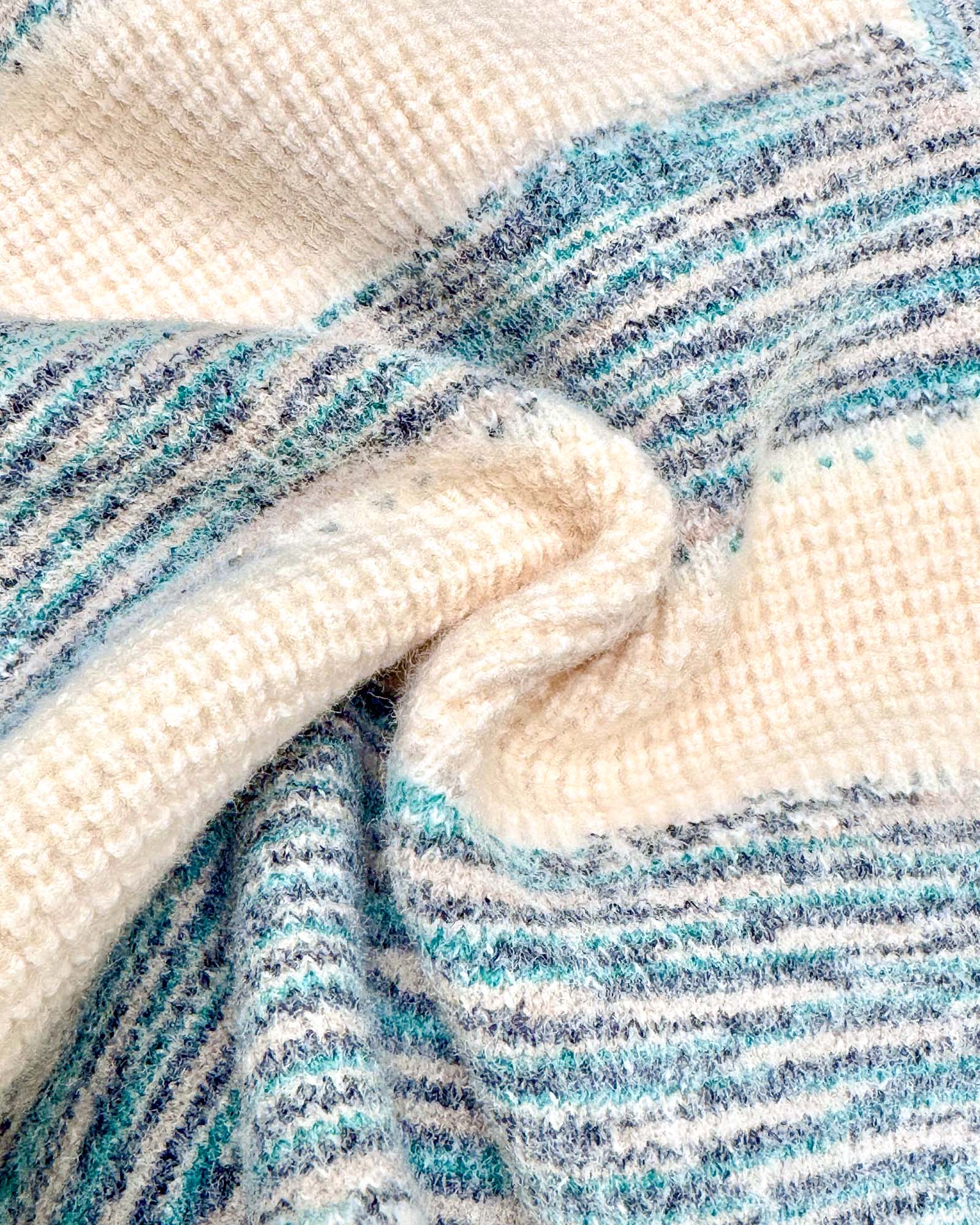 - Trendy Striped Design: Green & cream tones with a sporty knitted logo detail.
