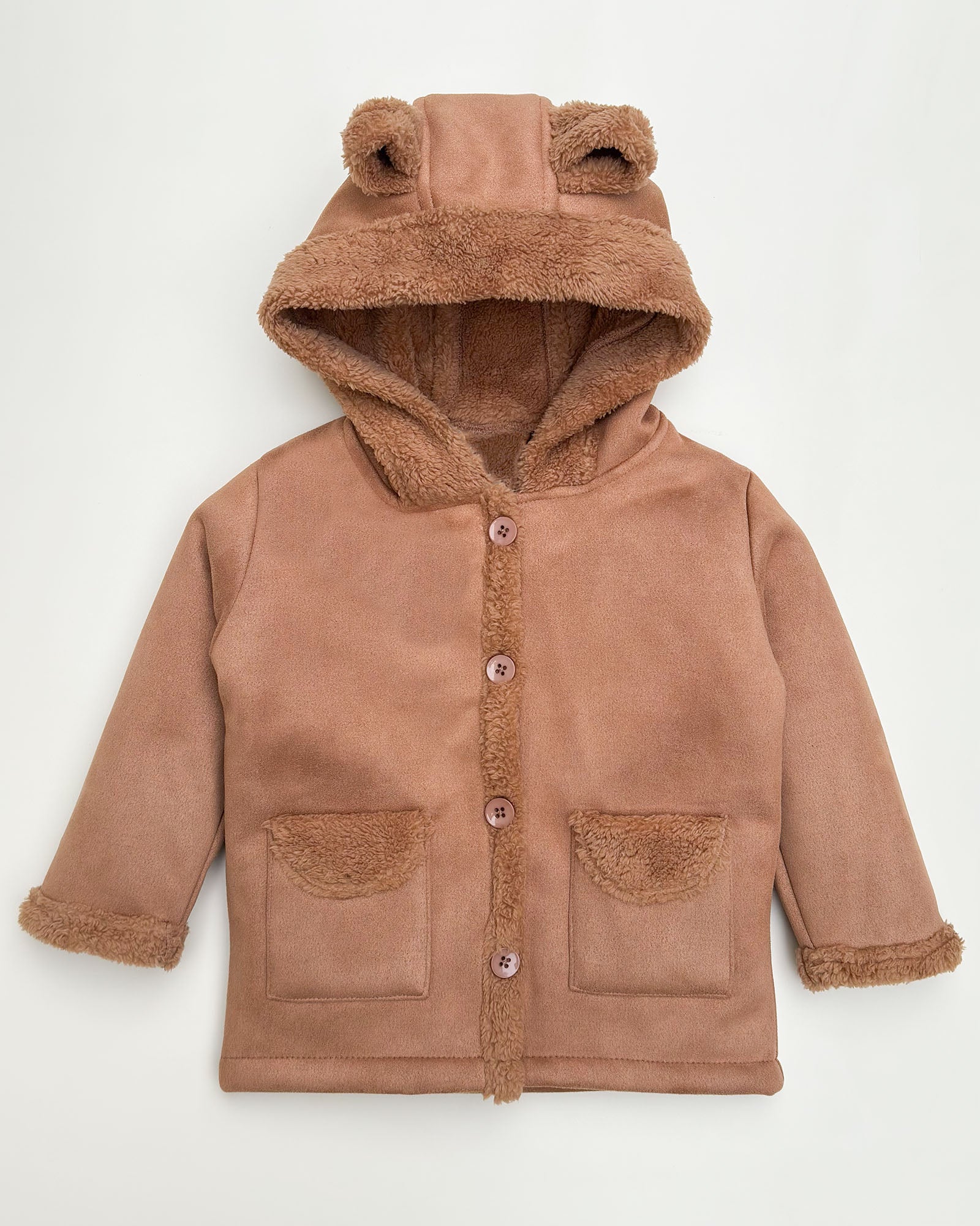 Designed in a rich walnut hue with a luxuriously soft suede-like outer and plush fleece lining, this coat is the perfect blend of comfort, warmth, and cuteness. The adorable bear-ear hood adds an extra dose of charm—because winterwear should be as cute as it is cozy! ❄️🐻