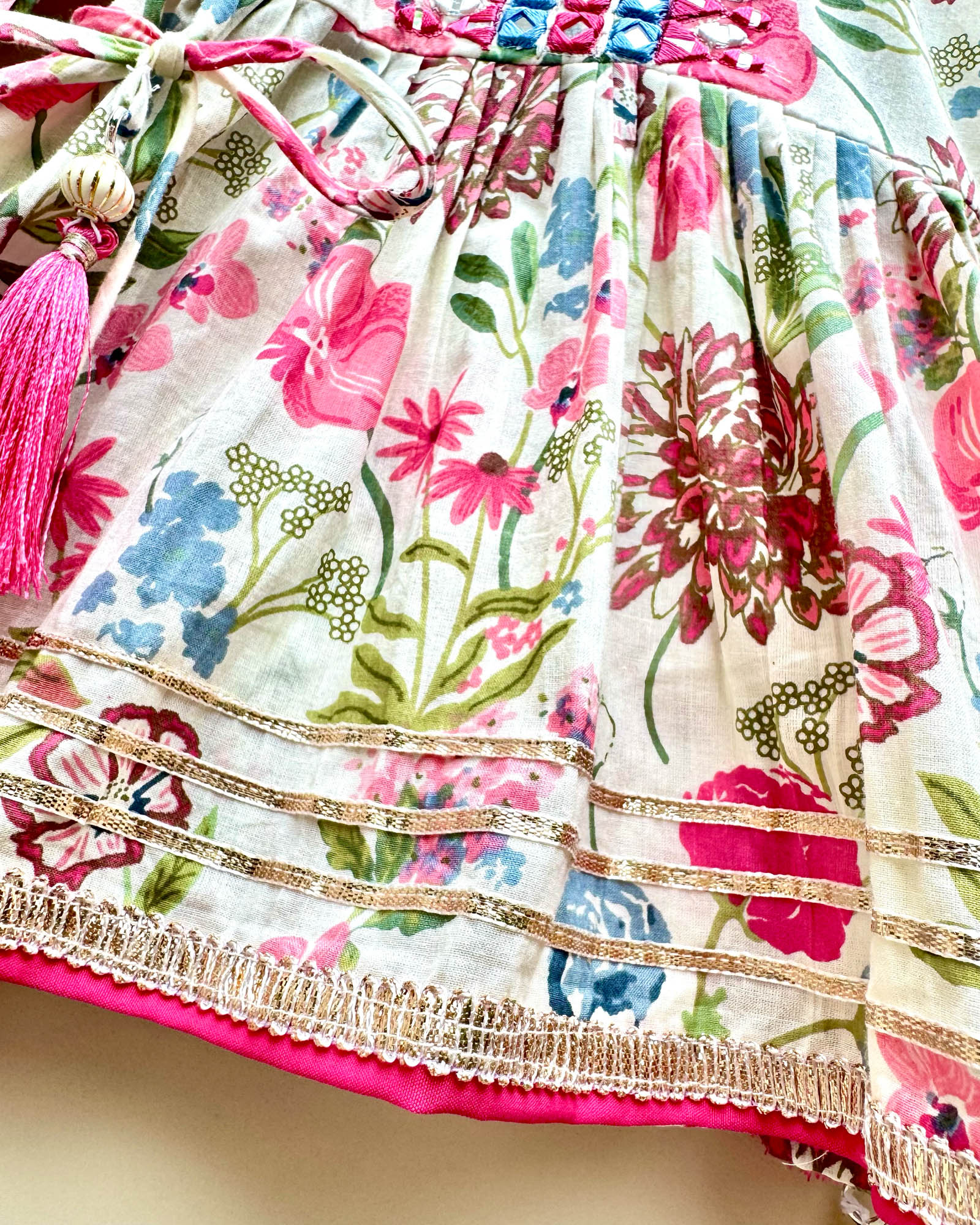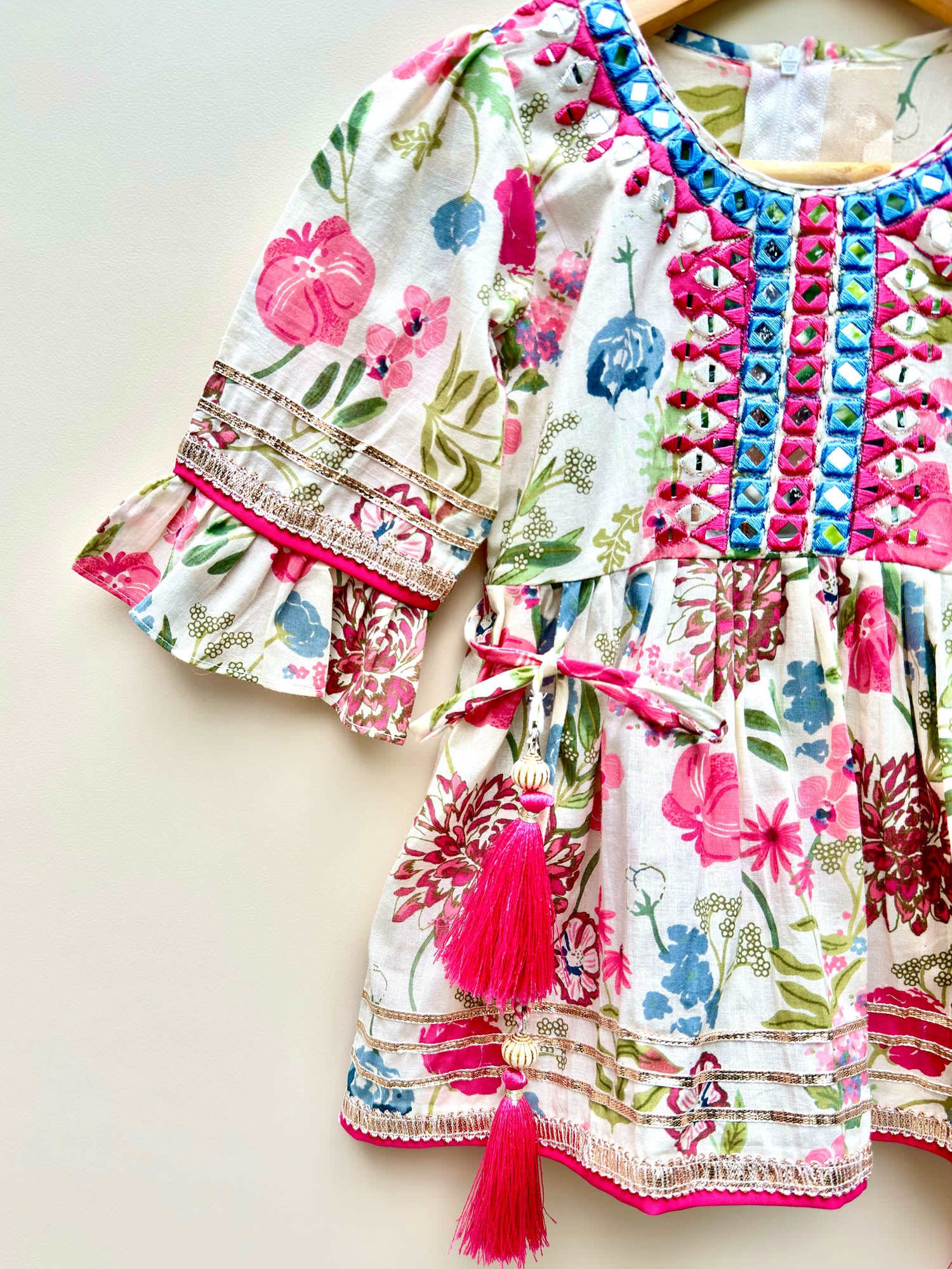 Dress your little angel in timeless elegance with our Traditional Embroidered Sharara Set in soothing off-white and pink hues. Designed with intricate embroidery, mirror work, and playful tassels, this festive kidswear outfit is the perfect blend of comfort and charm for every special occasion.