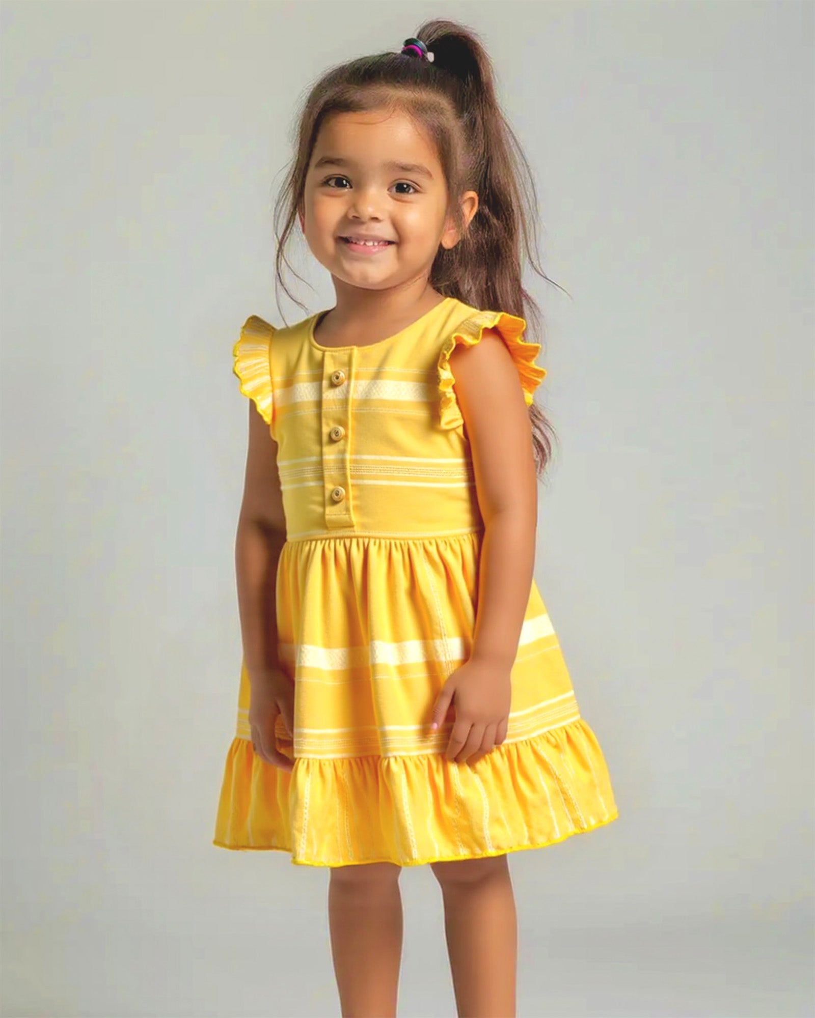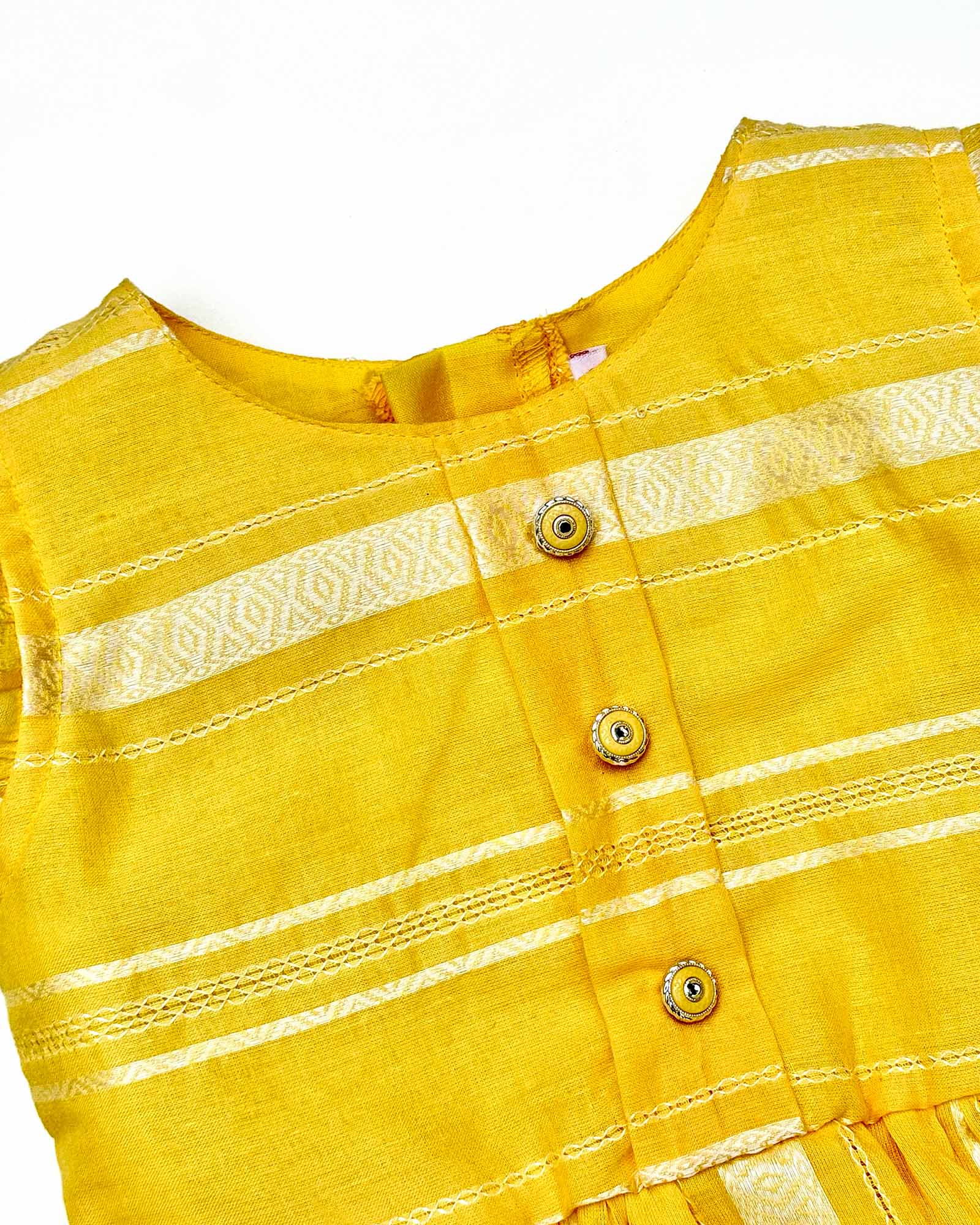 - Elegant sunshine yellow frock with delicate embroidery detailing.