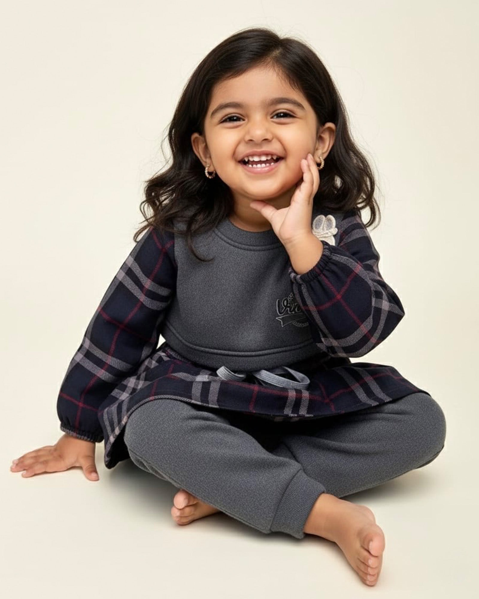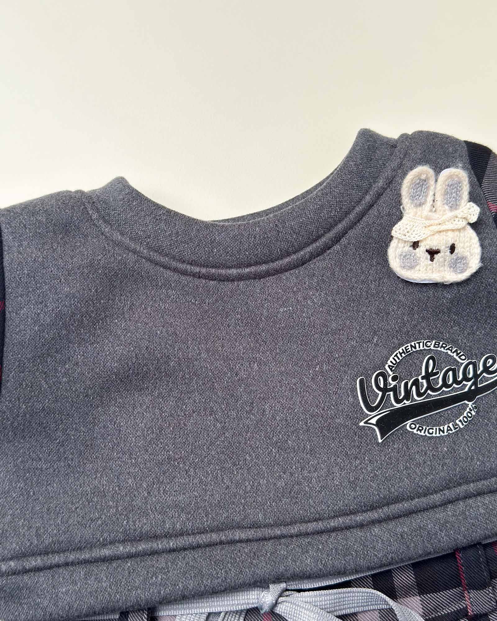 Designed for the little one who loves a classic look with a playful twist, this set is a winter wardrobe essential. The rich chocolate brown fleece bodice is as soft as a warm hug and features a charming bunny applique and "Vintage" embroidery for that high-end boutique feel. Paired with a timeless plaid check skirt and matching fleece trousers, this co-ord set is built for all-day comfort and endless winter twirling!