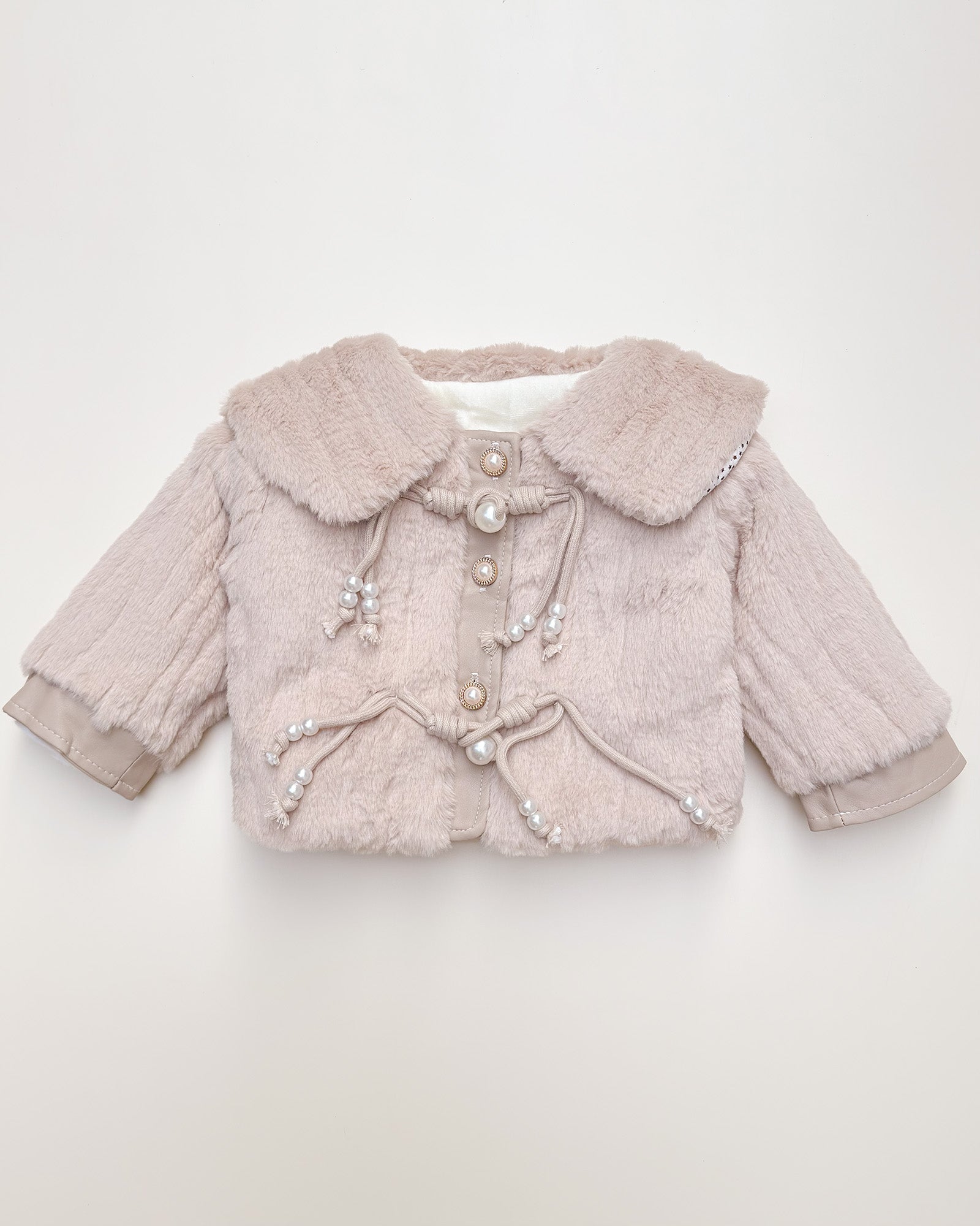 Crafted with luxuriously soft faux-fur fleece and adorned with delicate pearl-detailed drawstrings, this jacket is all about snuggly feels, statement style, and picture-perfect moments. Whether it’s a family outing, festive occasion, or a chilly-day cuddle session, this jacket ensures your baby shines with irresistible cuteness!