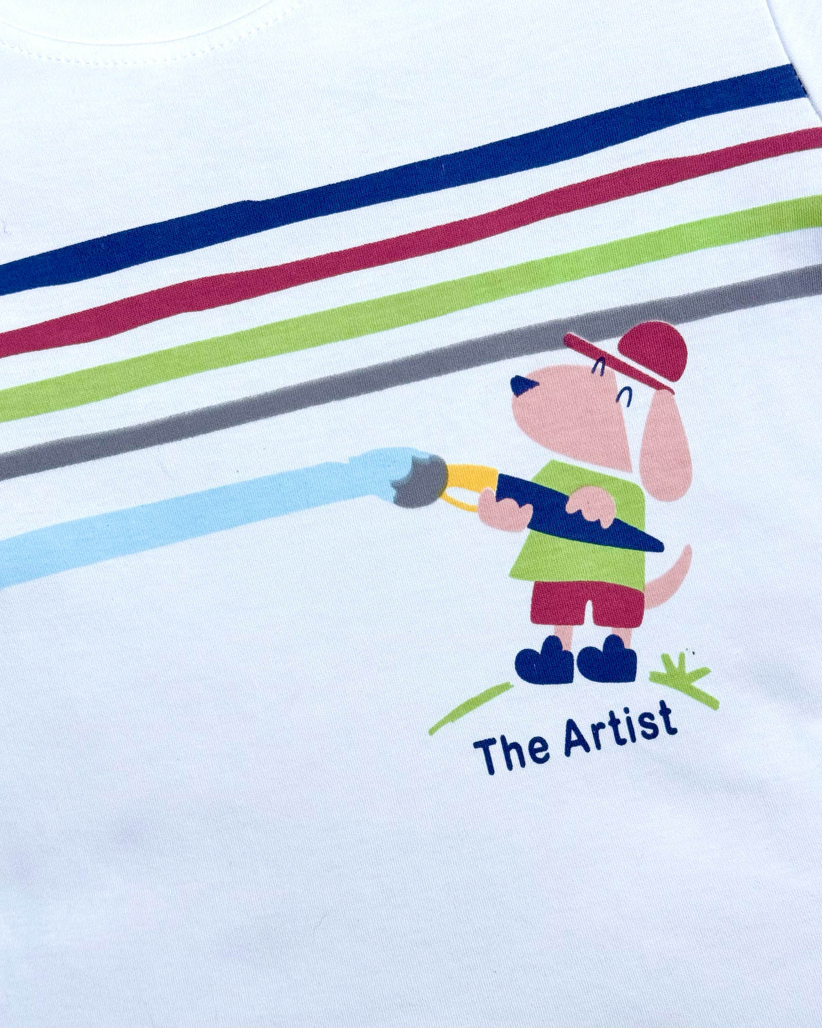 The white short-sleeve t-shirt features a cheerful dog artist illustration with multicolored stripes that give off fun, summery vibes. Paired with matching printed shorts featuring an all-over cartoon dog motif and contrast green trims, this co-ord set is crafted from soft, breathable cotton—ideal for warm weather playdates and cozy indoor moments.